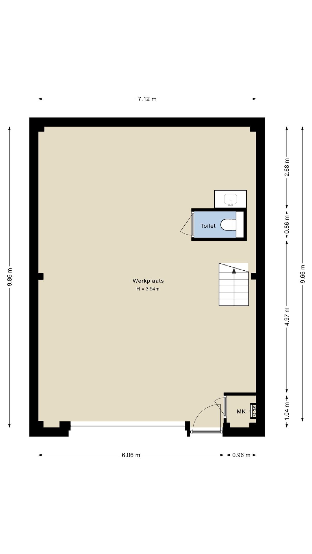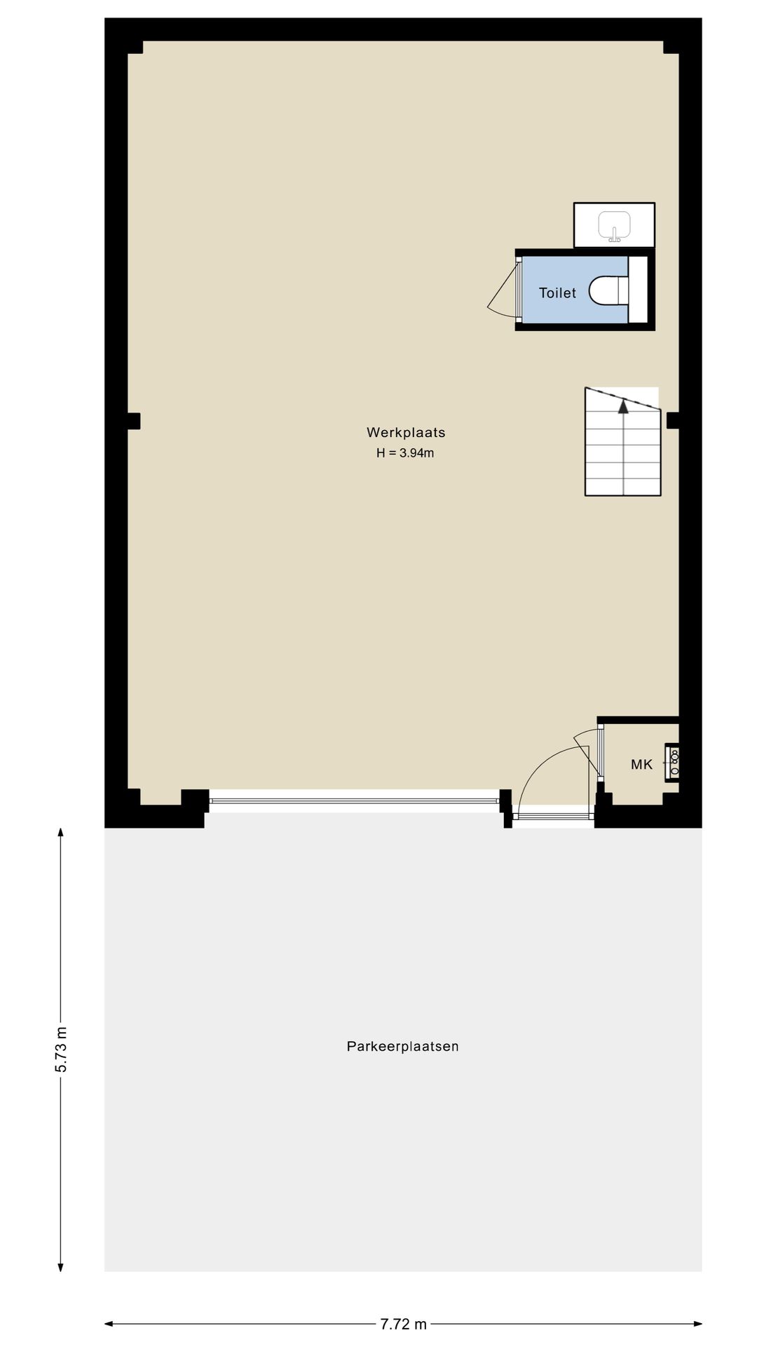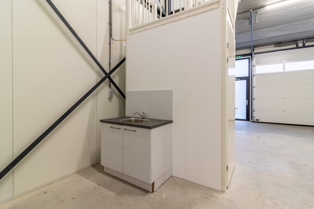 De begane grond heeft een vrije hoogte van circa 3,9 meter, wat de ruimte zeer geschikt maakt voor opslag of werkplaatsgebruik. Op de begane grond zijn tevens een pantry en een toiletruimte aanwezig. De tussenverdieping is uitstekend bruikbaar als kantoor, showroom of extra opslagruimte.