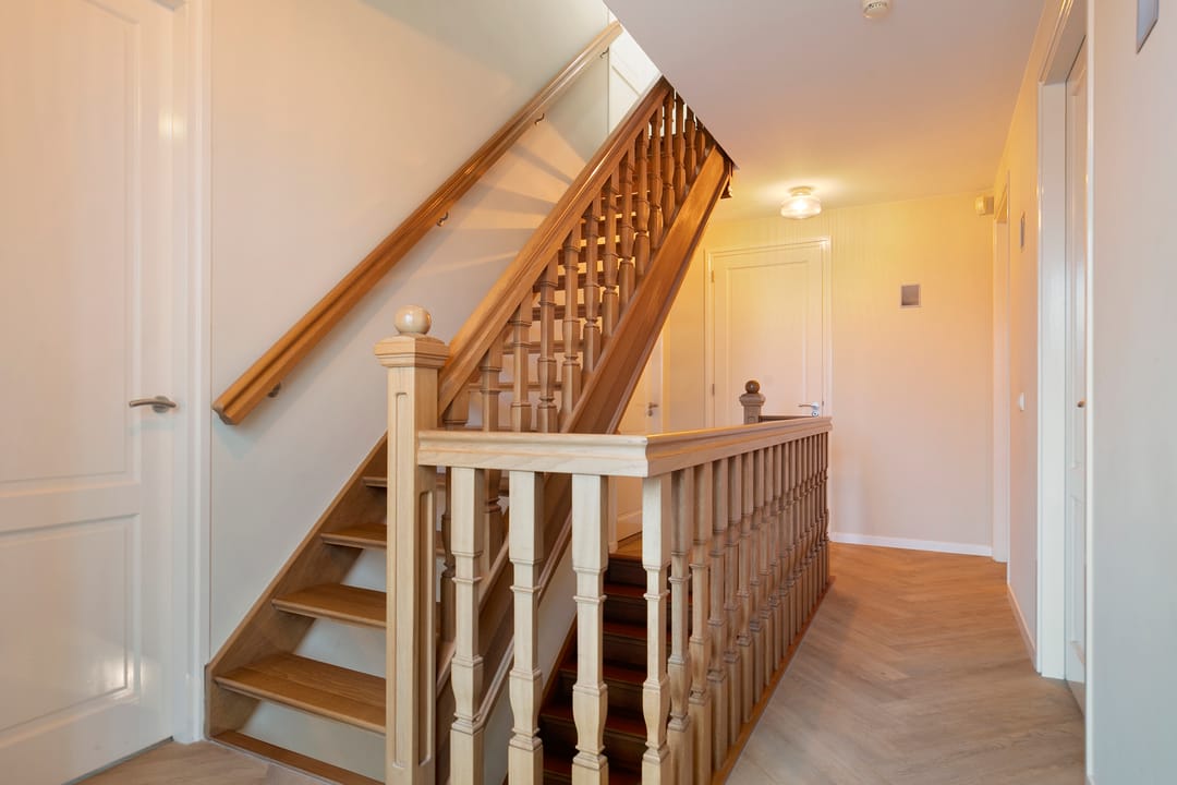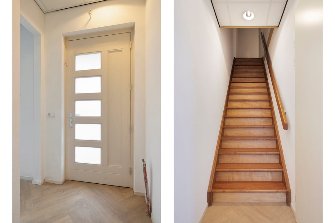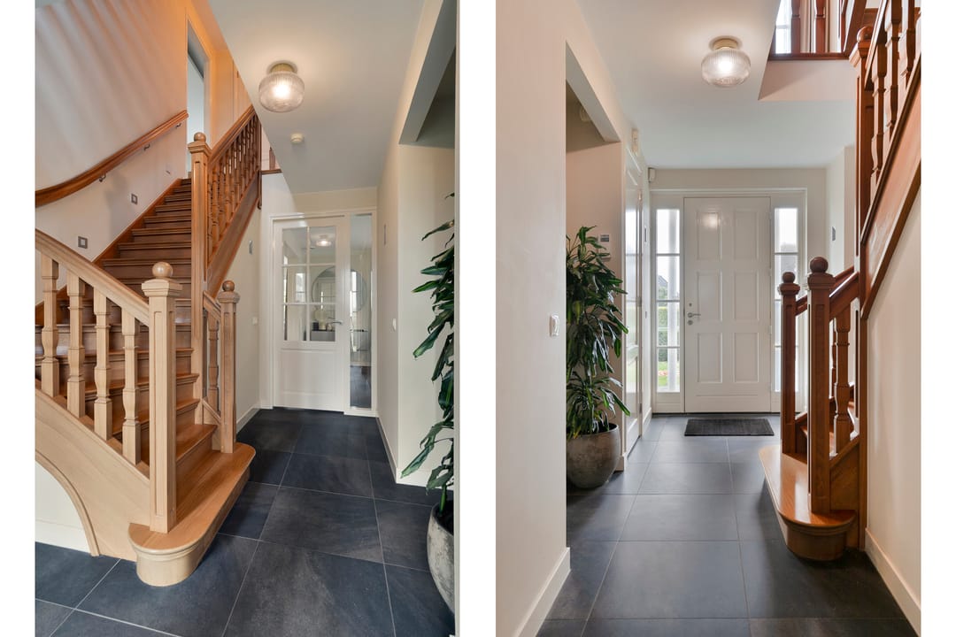 Entreehal met een tegelvloer met vloerverwarming, een uitgebreide meterkast, stucwerkwanden en een statige houten trap naar de verdieping.