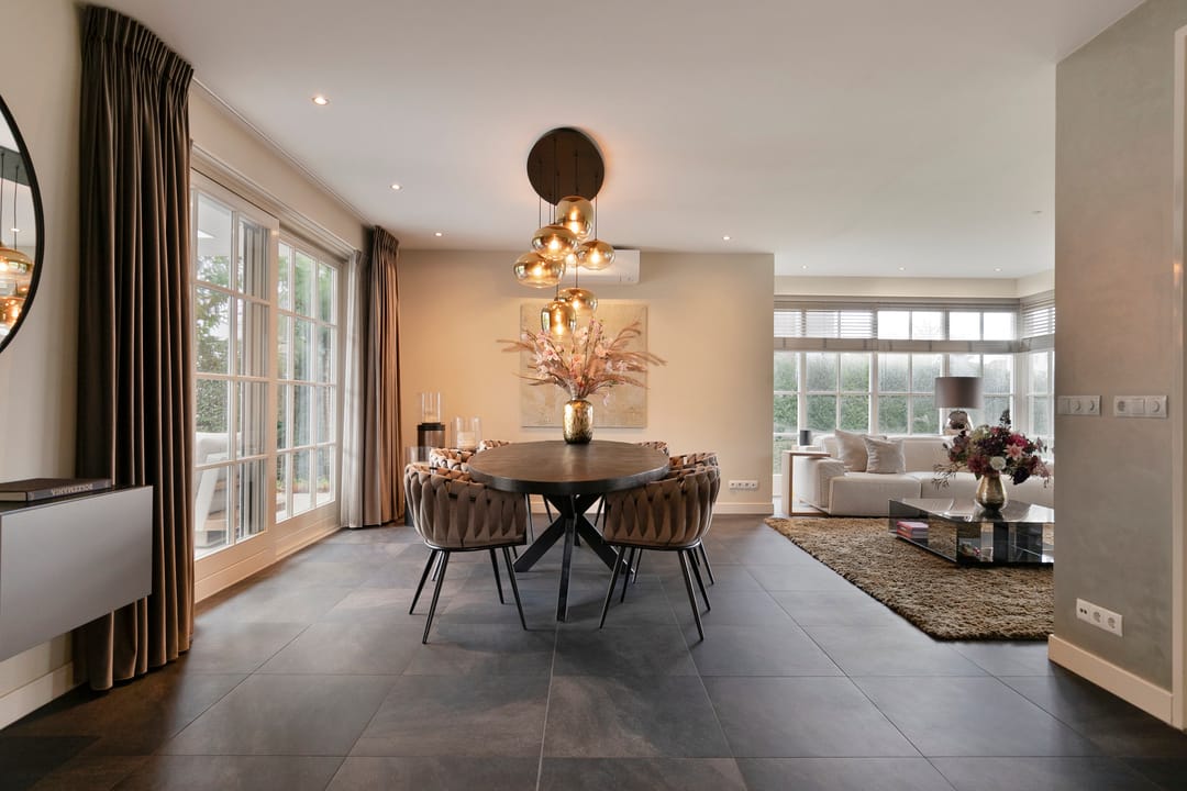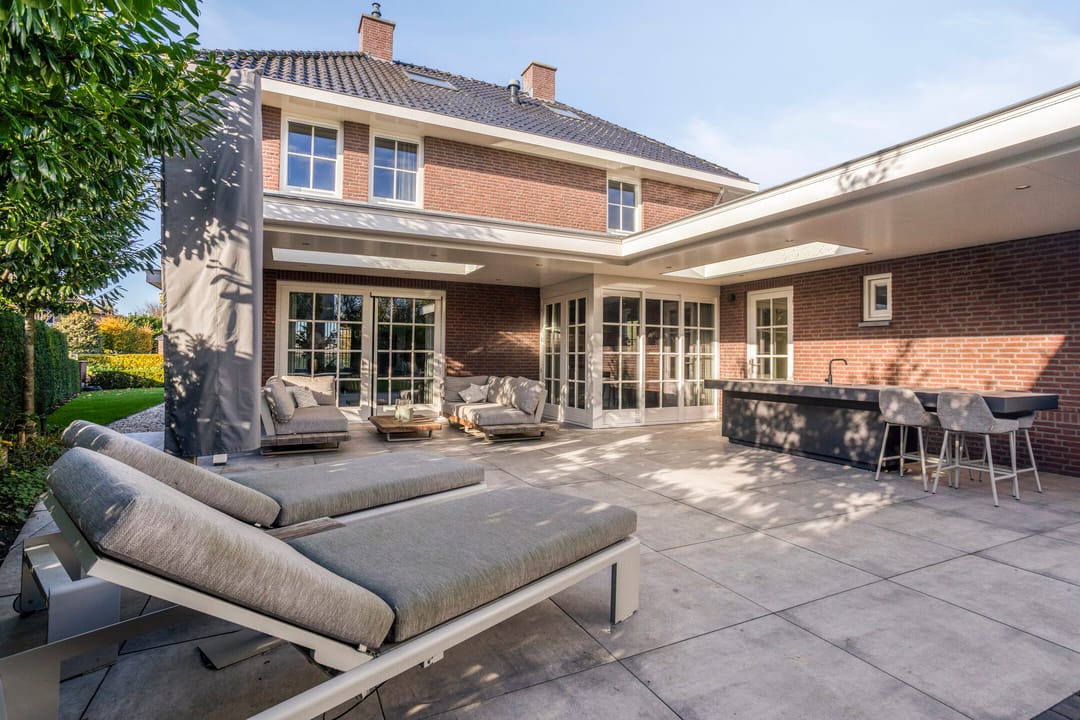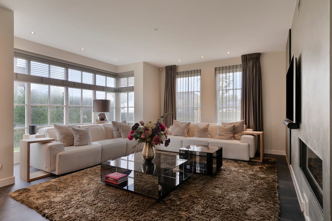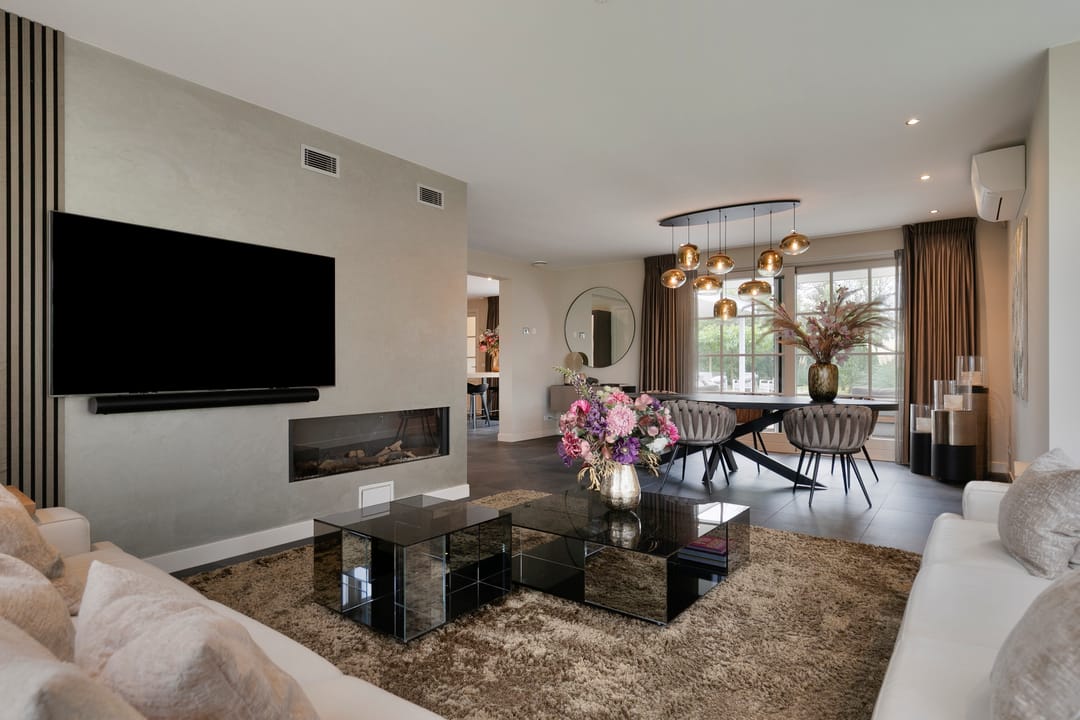 De L-vormige woonkamer is groot circa 40 m2, met een warme, keramische tegelvloer met vloerverwarming, stucwerkwanden, een stucwerkplafond met inbouwspots, een sfeervolle gashaard, een zij-erker, airconditioning en een schuifpui met een hor naar het overdekte terras met een lichtstraat. Heerlijk zitten met zicht op de fraaie tuin.