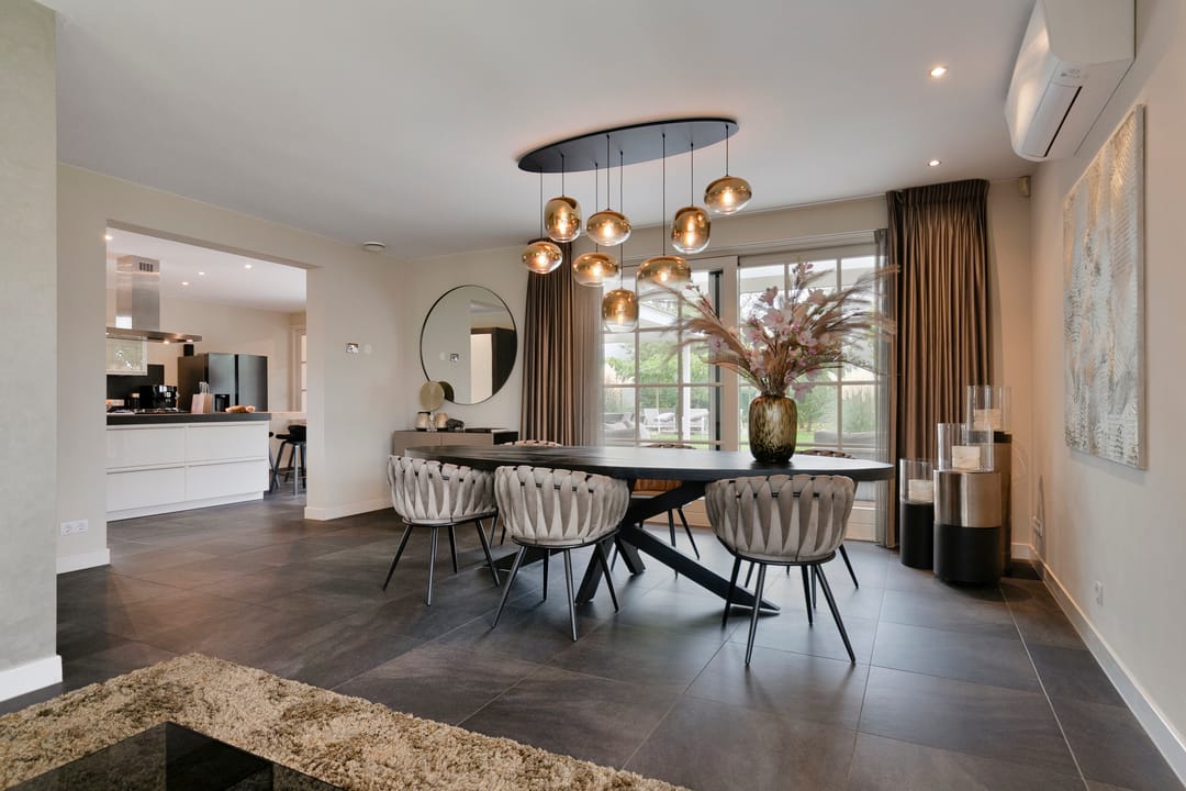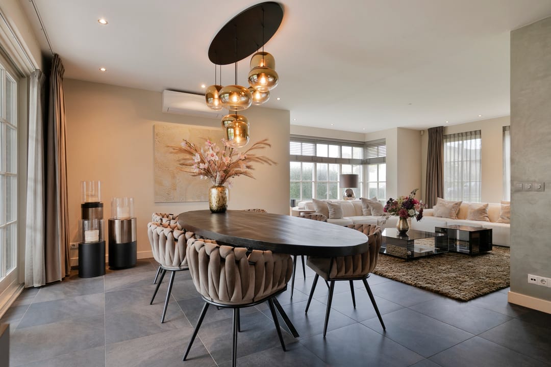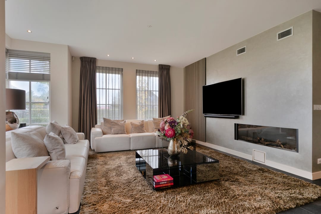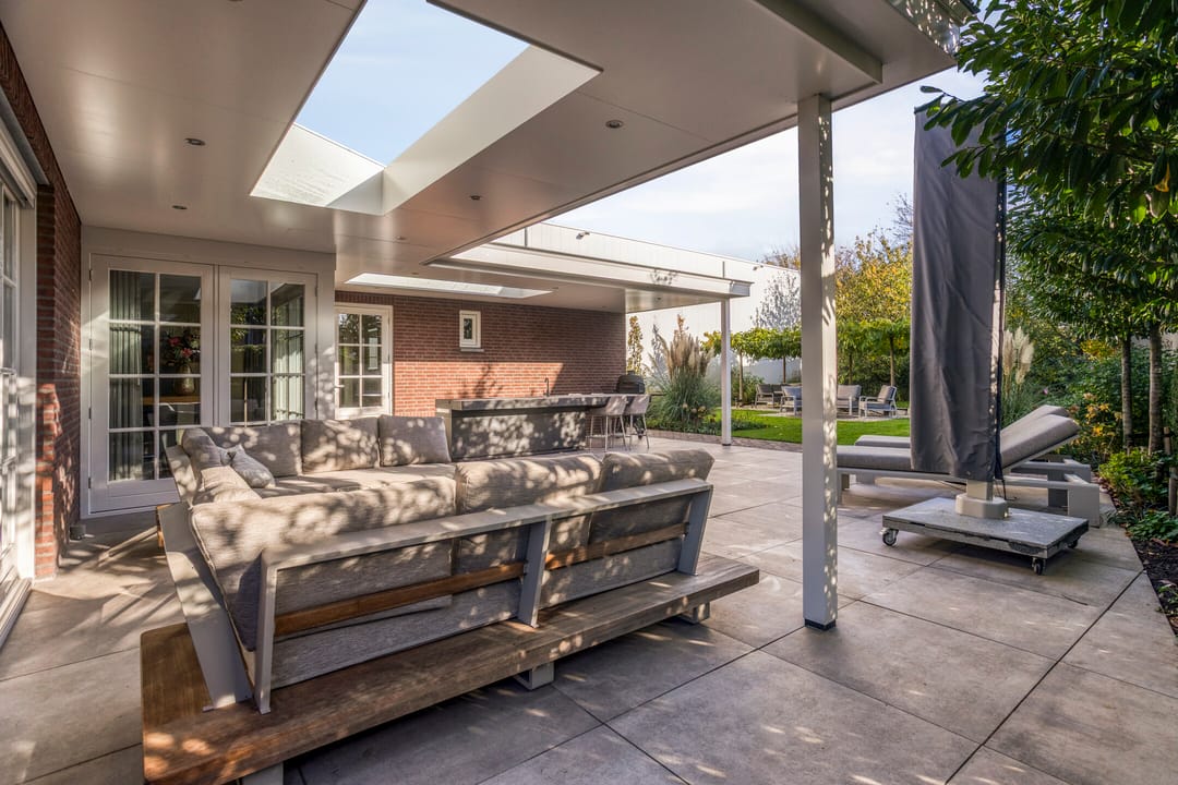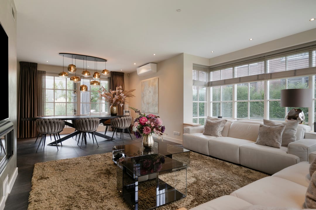 De L-vormige woonkamer is groot circa 40 m2, met een warme, keramische tegelvloer met vloerverwarming, stucwerkwanden, een stucwerkplafond met inbouwspots, een sfeervolle gashaard, een zij-erker, airconditioning en een schuifpui met een hor naar het overdekte terras met een lichtstraat. Heerlijk zitten met zicht op de fraaie tuin.