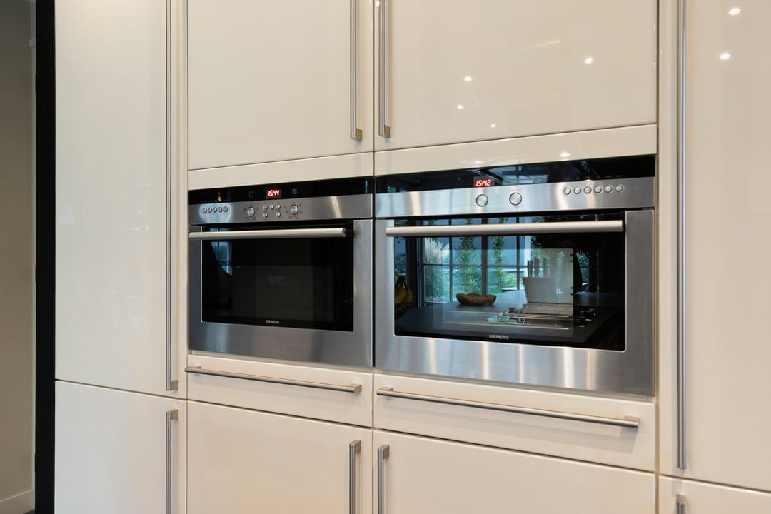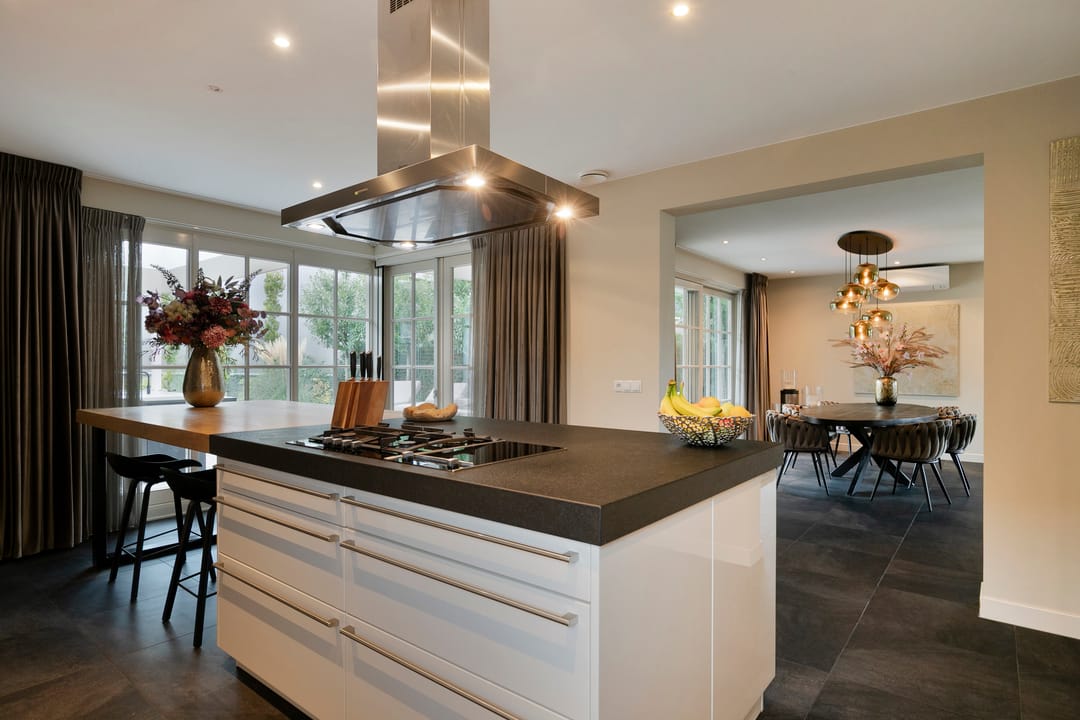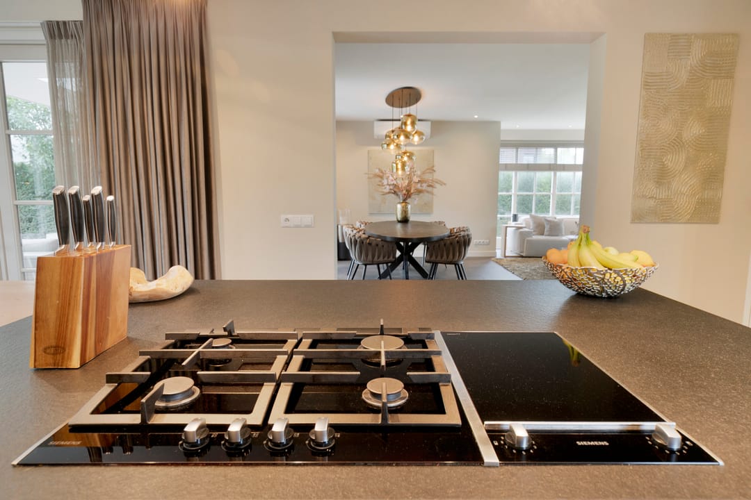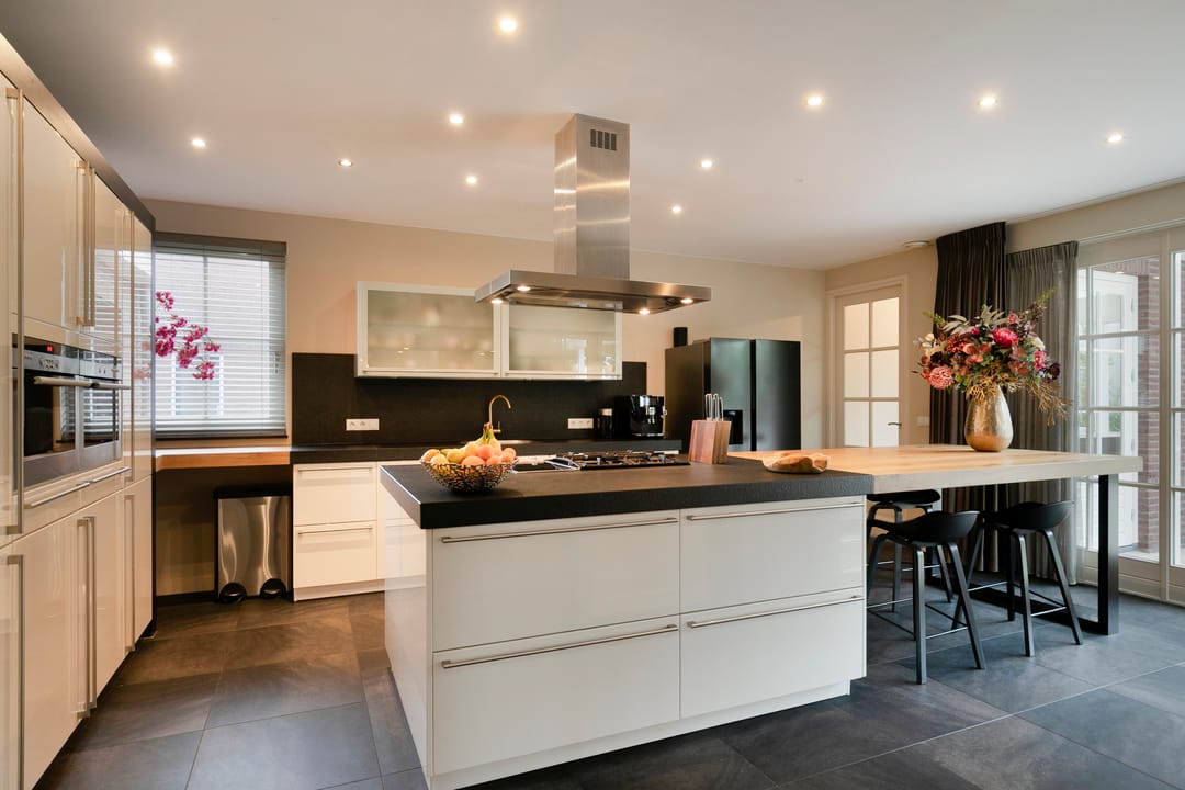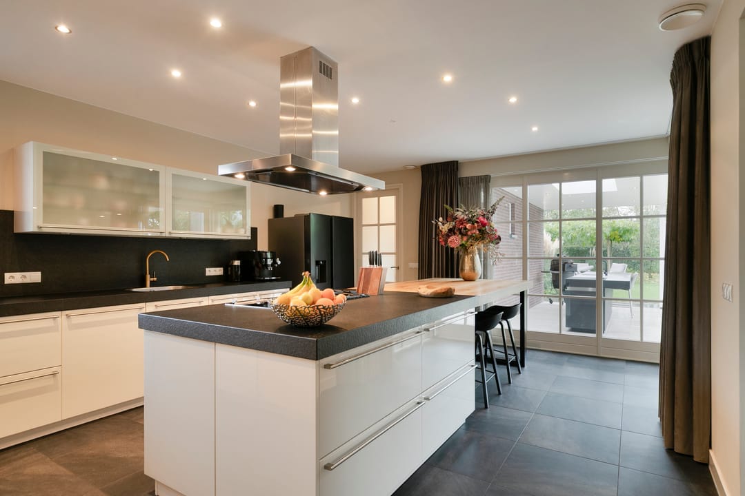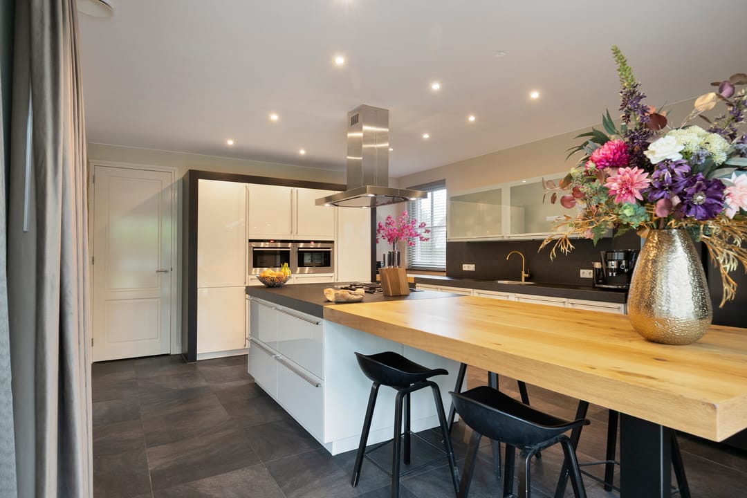 De keuken is groot circa 4.40 x 6.18 meter, met eenzelfde tegelvloer met vloerverwarming, stucwerkwanden en een stucwerkplafond met inbouwspots, en een heel complete keukeninrichting, bestaande uit een hoekopstelling en een kook-/eeteiland, voorzien van een getrommeld granieten blad, een 4-pitten gaskookplaat met grillplaat, een afzuigkap, een combioven en een stoomoven, een vaatwasser en een koelkast.