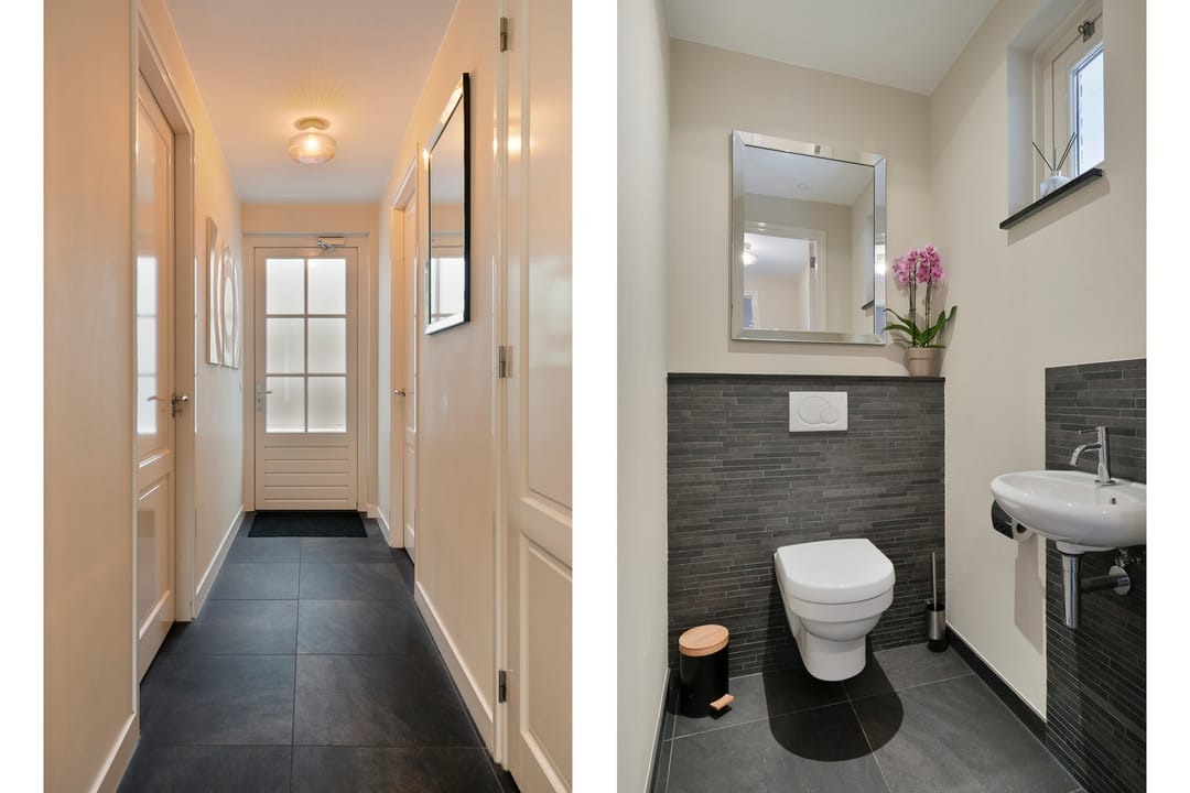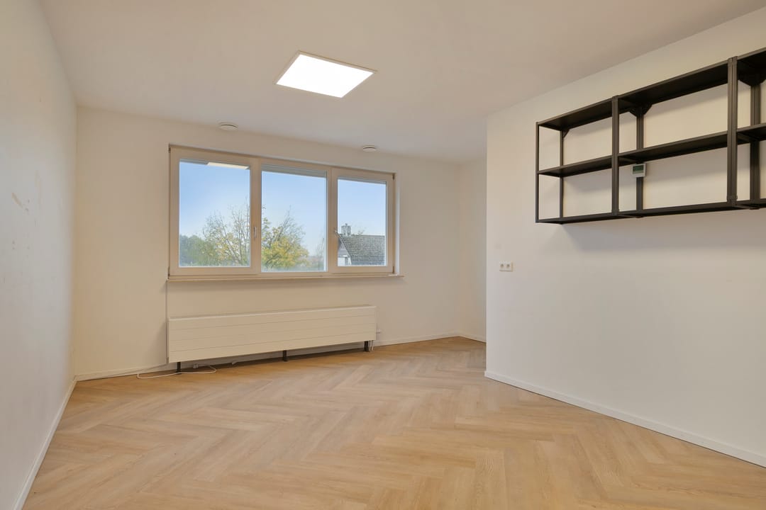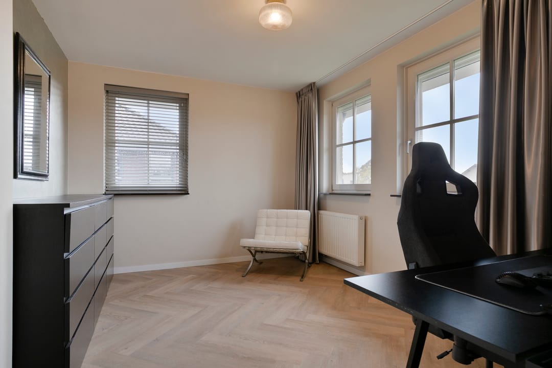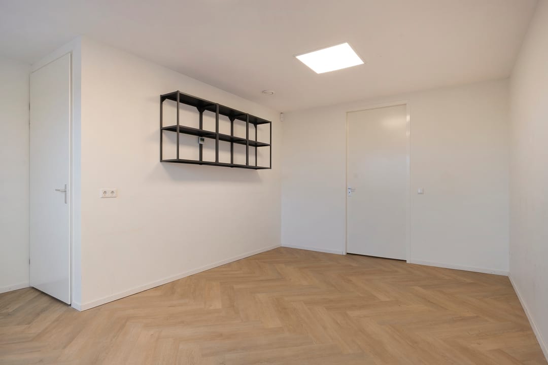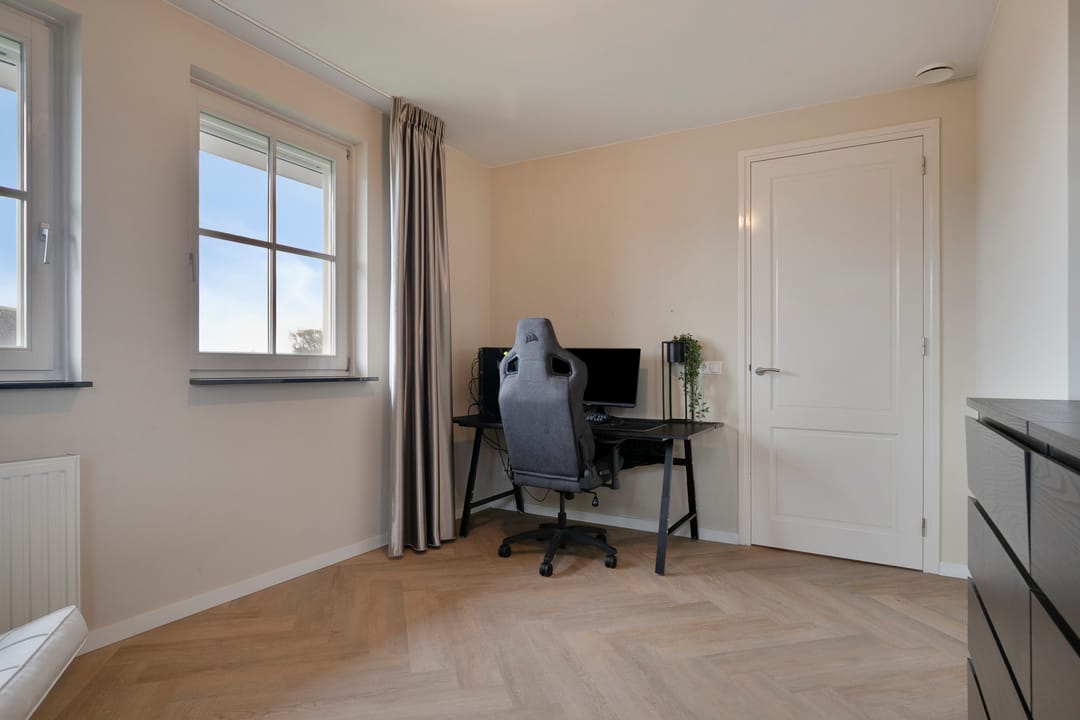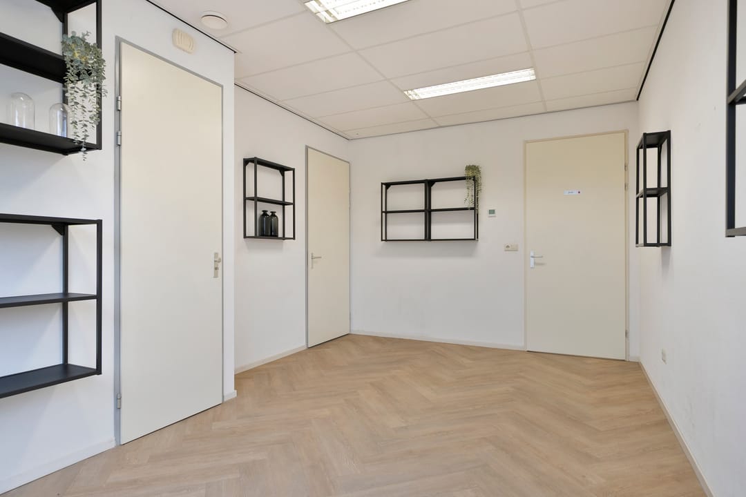 Ter linkerzijde van de entreehal bevindt zich een kantoorkamer, groot circa 3.34 x 3.85 meter, met een tegelvloer met vloerverwarming, stucwerkwanden en inbouwspots.