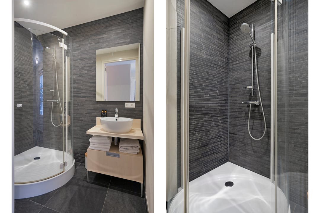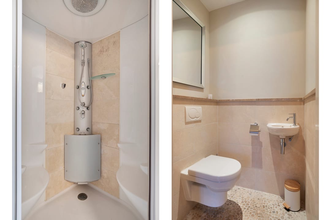 Fraai betegelede badkamer begane grond met een douchecabine en een waskom op een meubel.