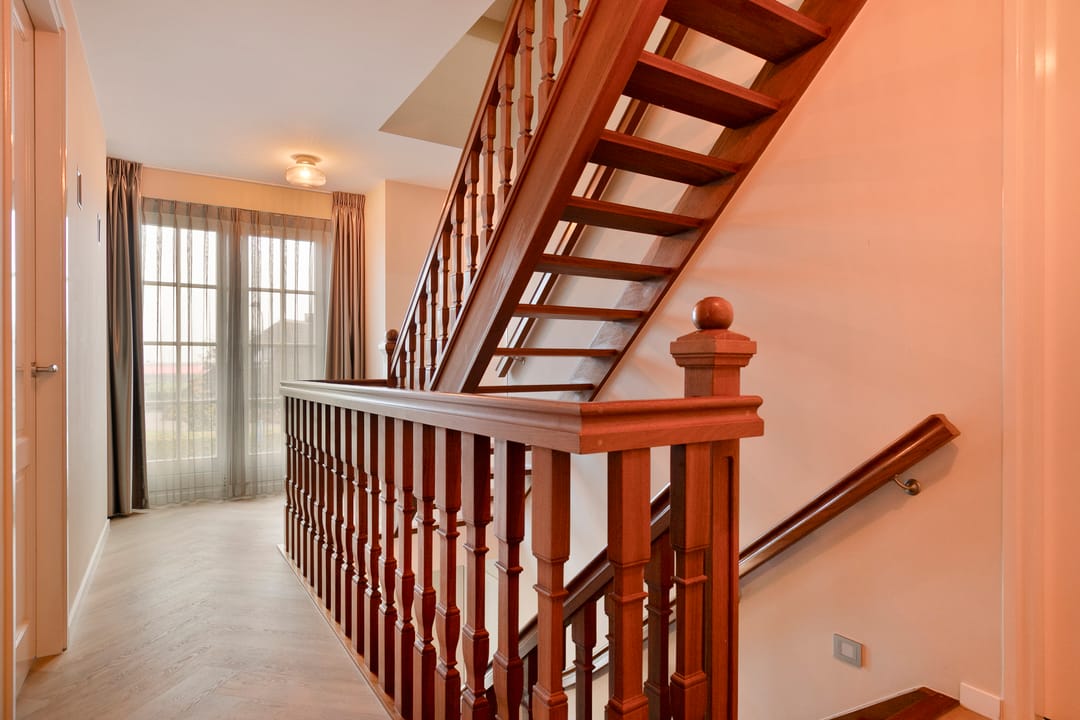 Overloop met een pvc-vloer, stucwerkwanden met wandlichtpunten, openslaande deuren naar de straatzijde, en toegang tot drie slaapkamers, de badkamer en een separaat toilet.