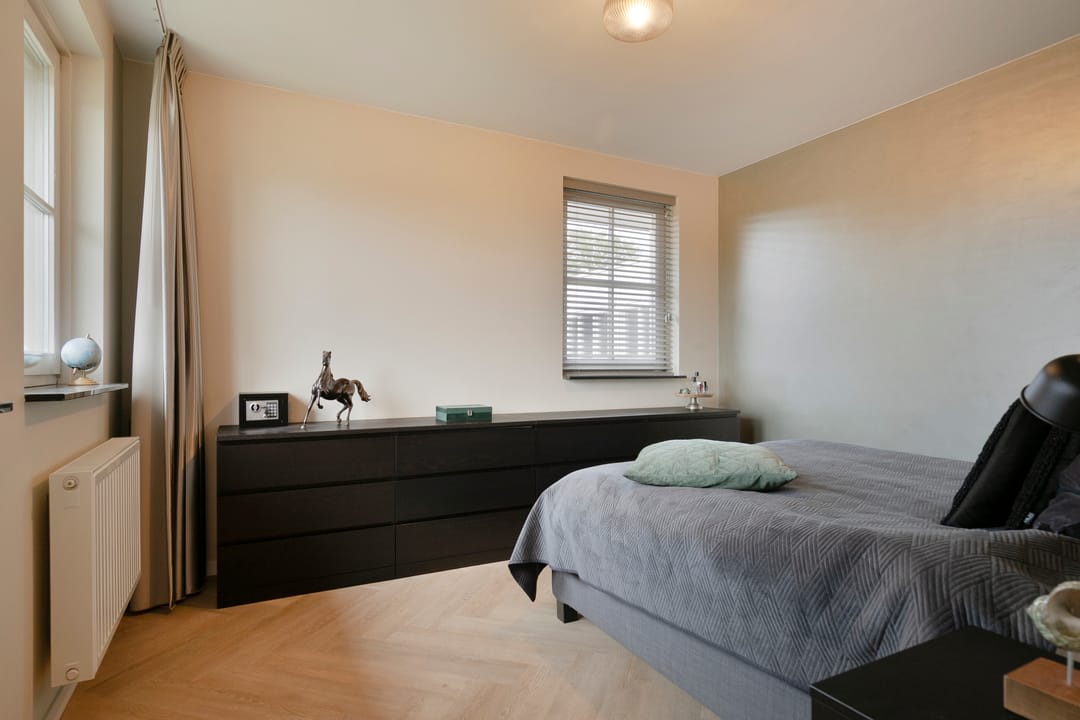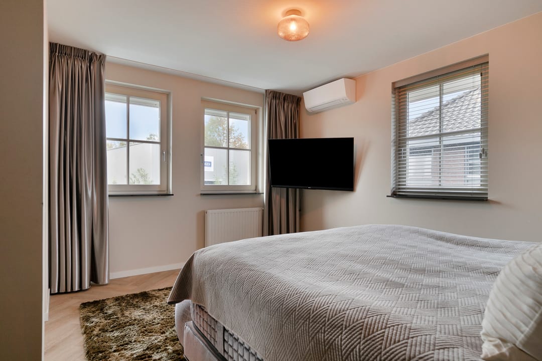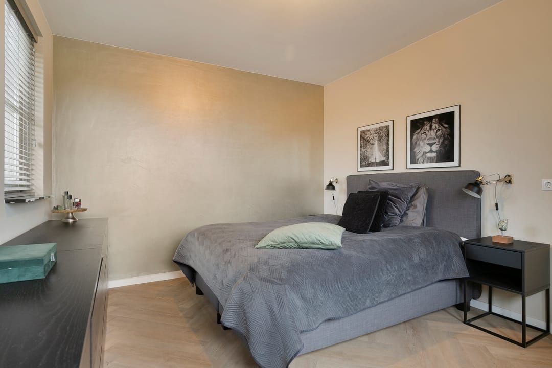 Slaapkamer 1: rechtsachter gelegen, groot circa 3.43 x 4.45 meter, met een pvc-vloer, stucwerkwanden, airconditioning (koelen en verwarmen circa 2020) en een ruime inloopkast (circa 1.69 x 2.76 meter);