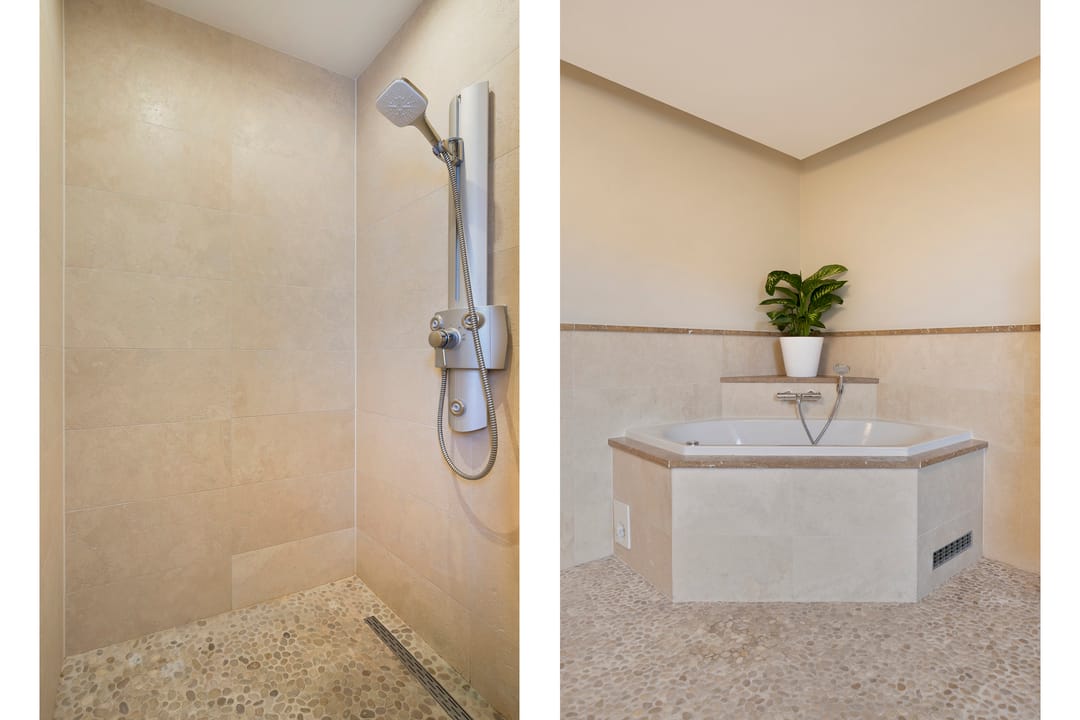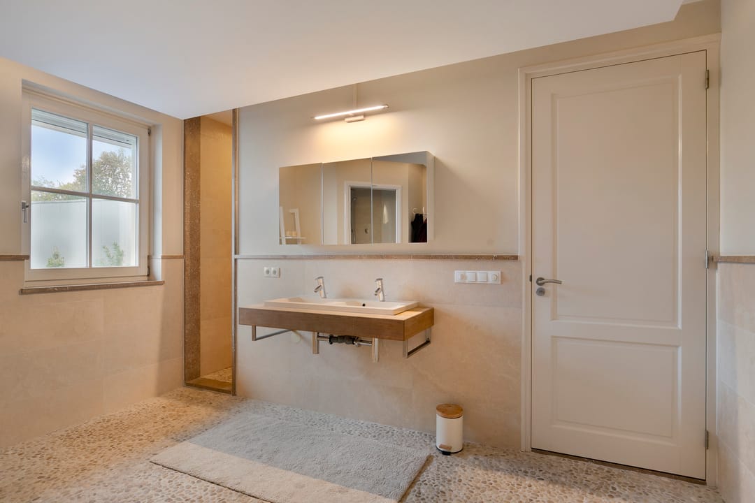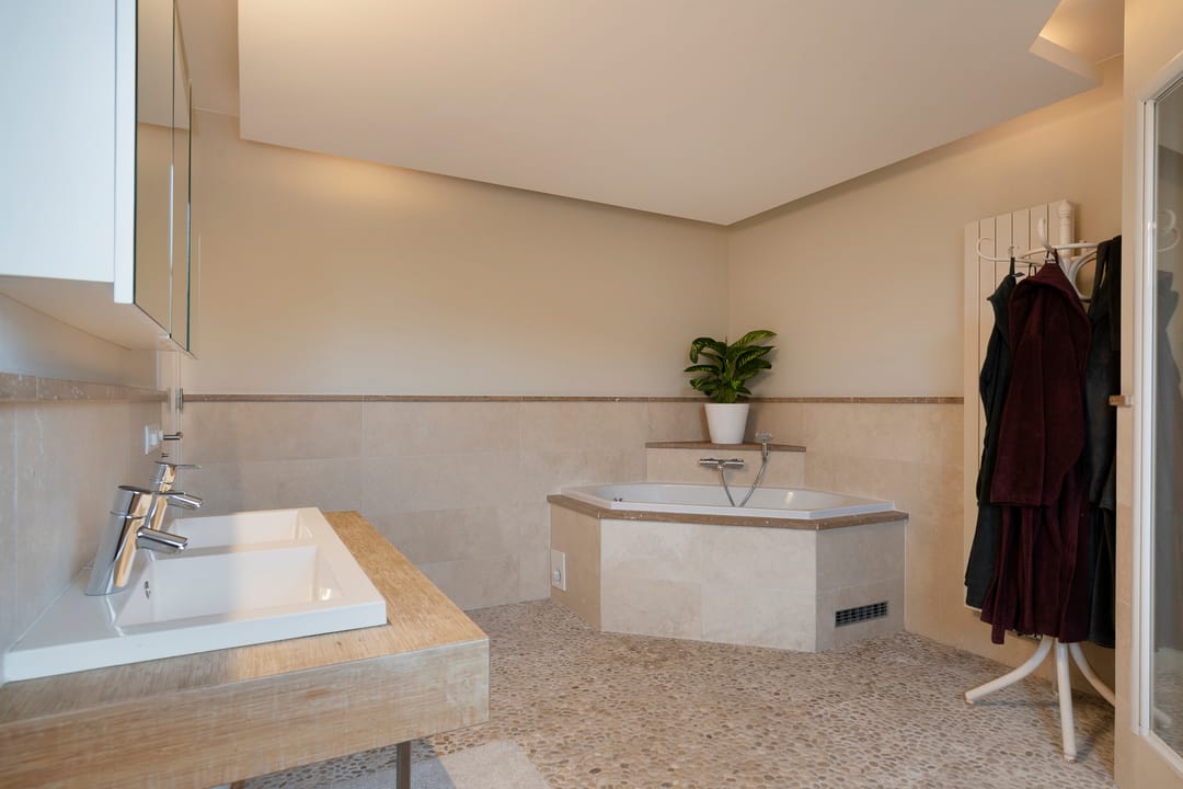 De badkamer is bijzonder stijlvol ingericht, met halfhoge wandbetegeling, een verlaagd plafond met indirecte verlichting, een vloer met kiezelstructuur met vloerverwarming, een ligbad met bubbelfunctie, een inloopdouche, een douchecabine/stoomdouche en een dubbele wastafel in een meubel;