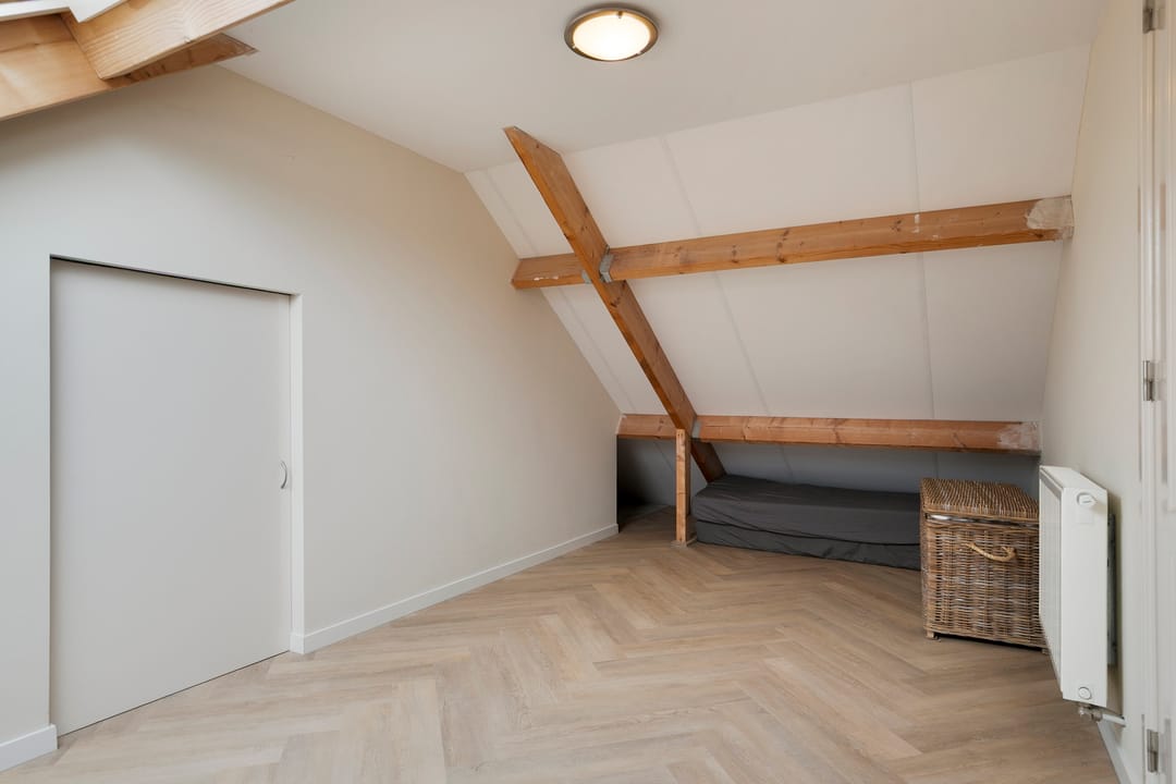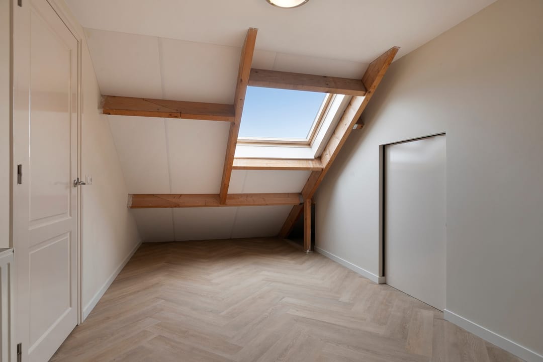 Slaapkamer, groot circa 2.71 x effectief 3.91 meter (tot aan 1.50 m1 lijn) met een pvc-vloer en een groot dakvenster. Een schuifdeur geeft toegang tot een bergruimte onder de knieschotten.