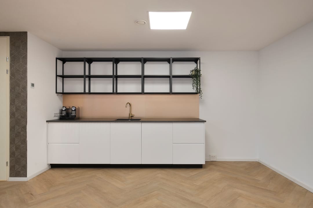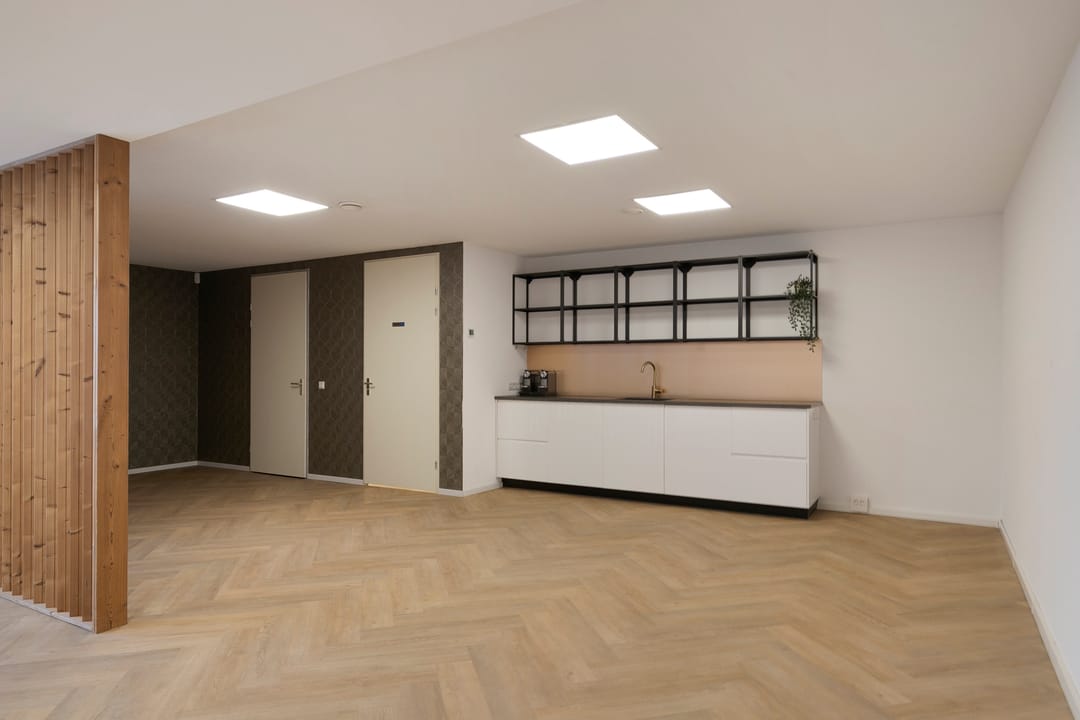 Kantoortuin met een pvc-vloer, LED-daglichtlampen, elektrische screens en een pantry met een vaatwasser en een koelkast. Bij deze kantoortuin bevindt zich een toiletruimte met een wandcloset en een fonteintje. Separate kantoorkamer met een pvc-vloer, LED-daglichtlampen, elektrische screens en kastruimte met de WTW-installatie.