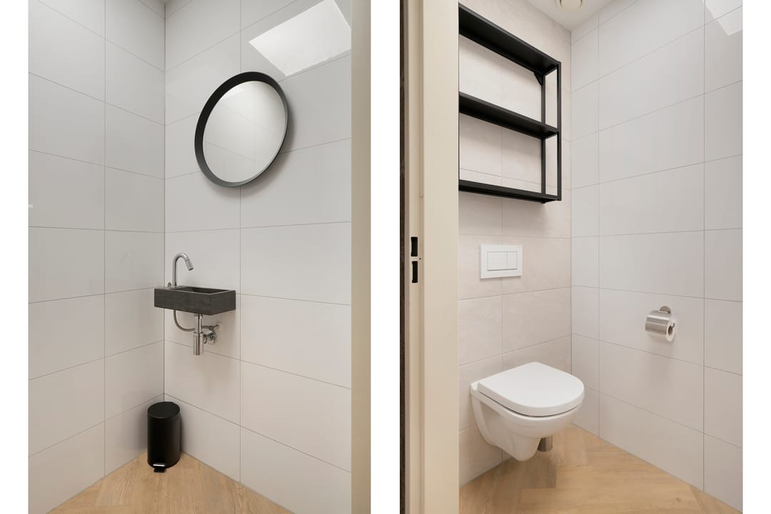 Achterhal met een toiletruimte met een wandcloset, een fonteintje en automatische verlichting.