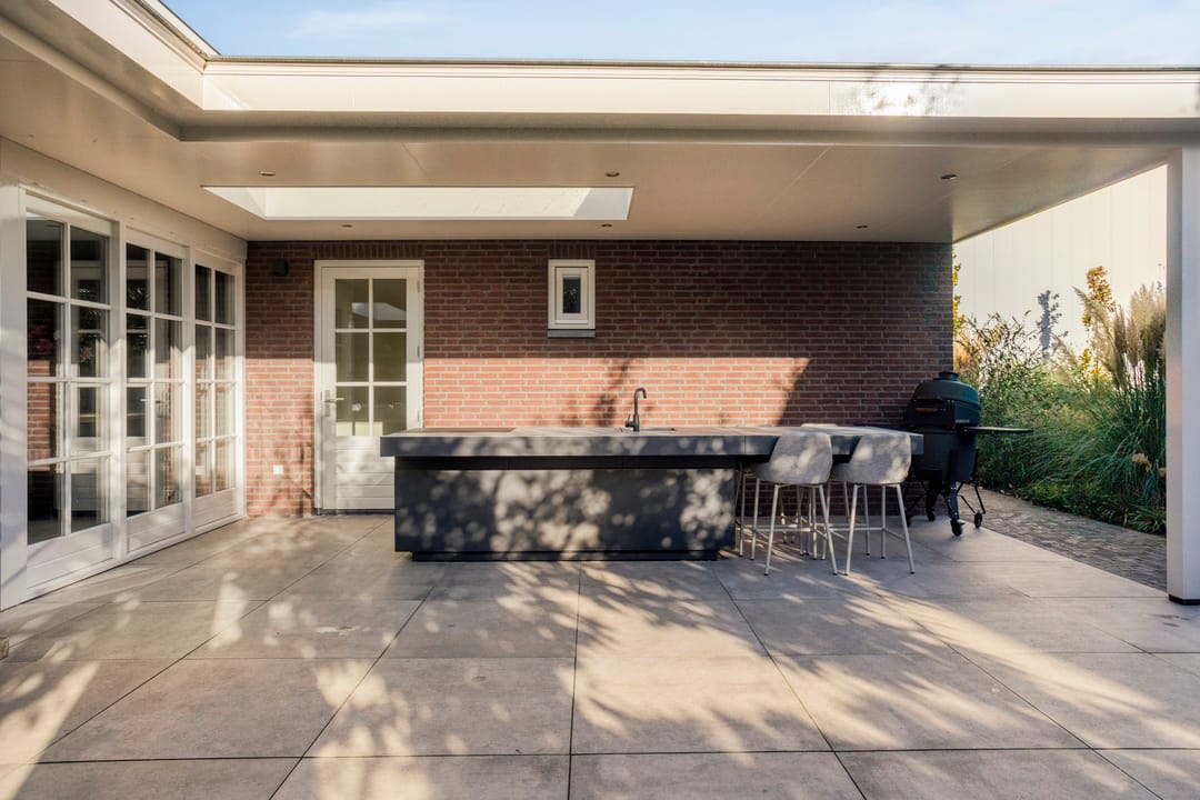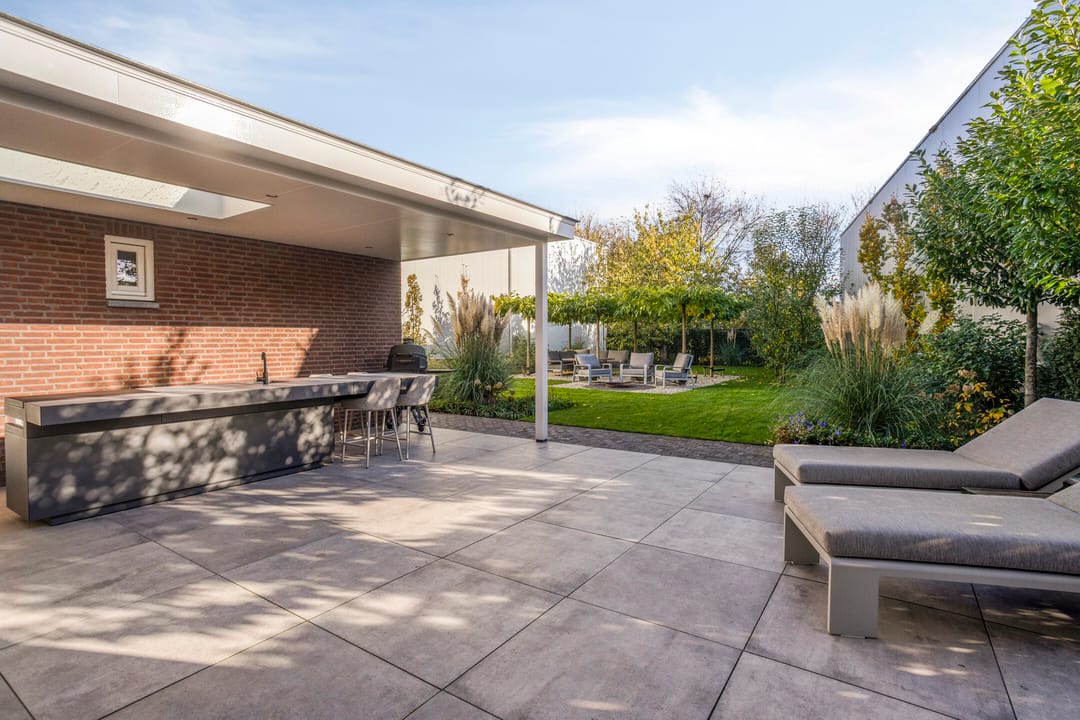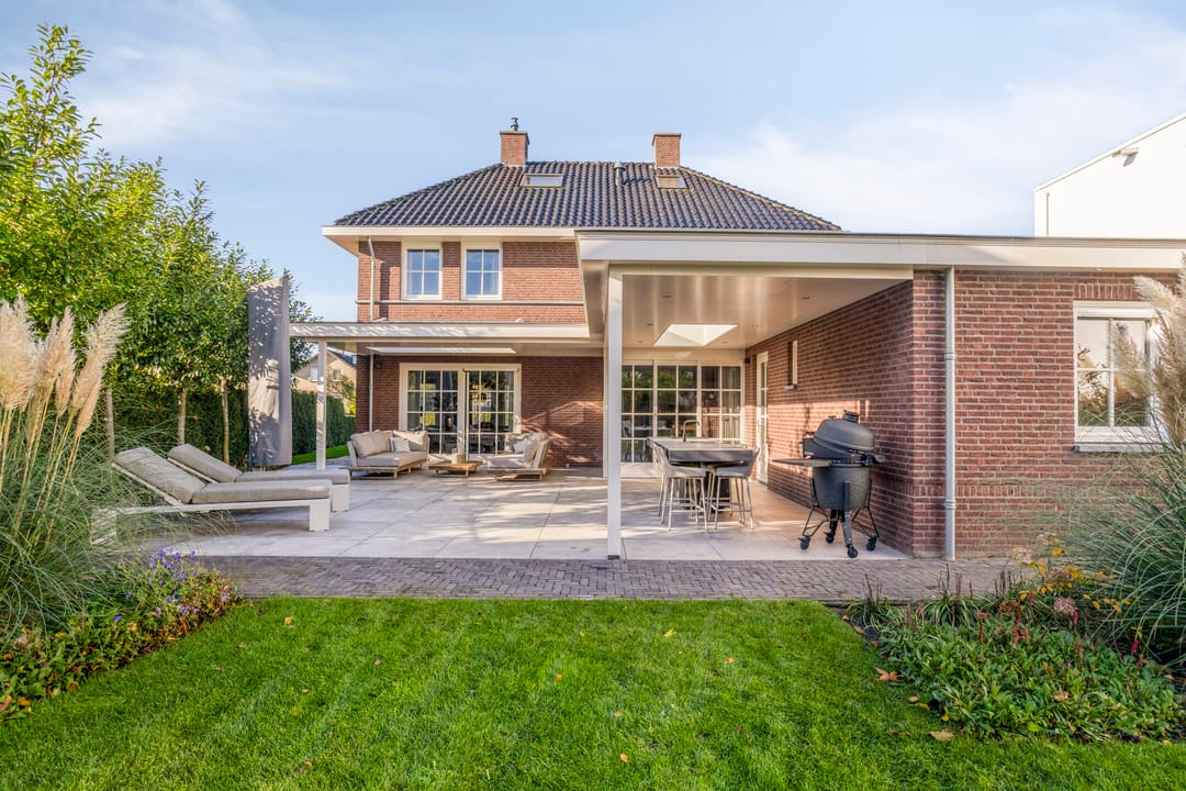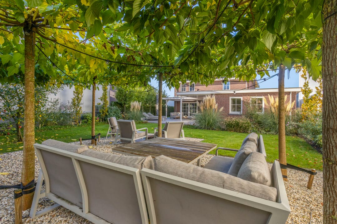 De achtertuin is gesitueerd op het oosten en is diep circa 32,50 meter. De tuin is bijzonder fraai aangelegd, met een groot terras met twee hoogwaardige terrasoverkappingen met ieder een lichtstraat en inbouwverlichting. Onder de tweede overkapping bevindt zich een complete buitenkeuken. Deze is ter overname.