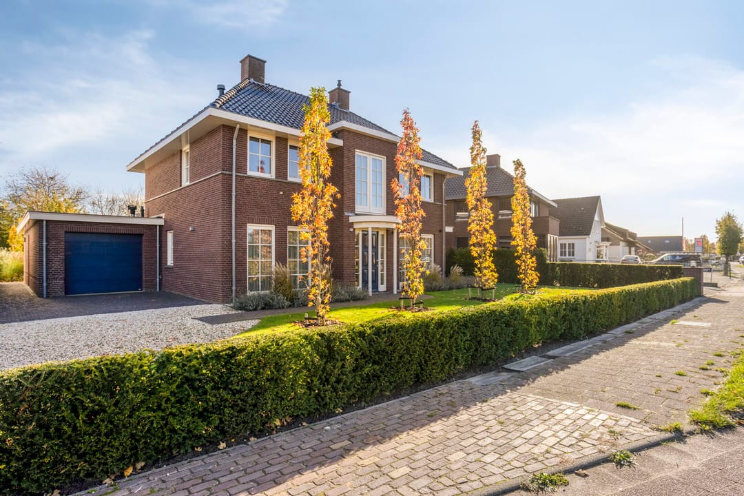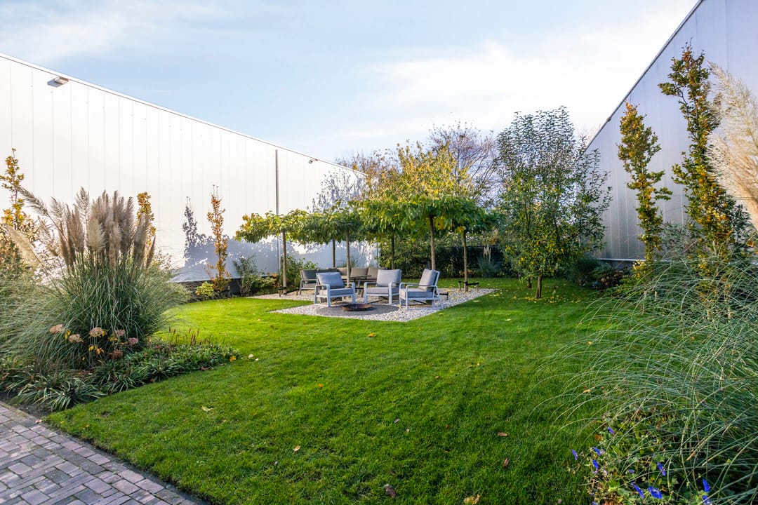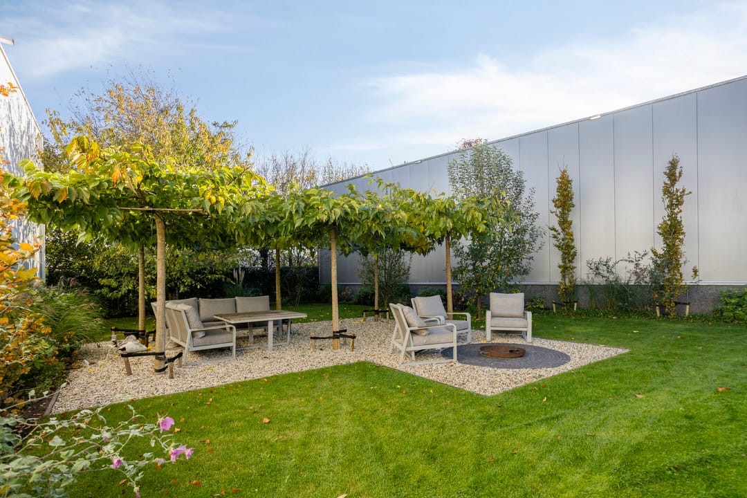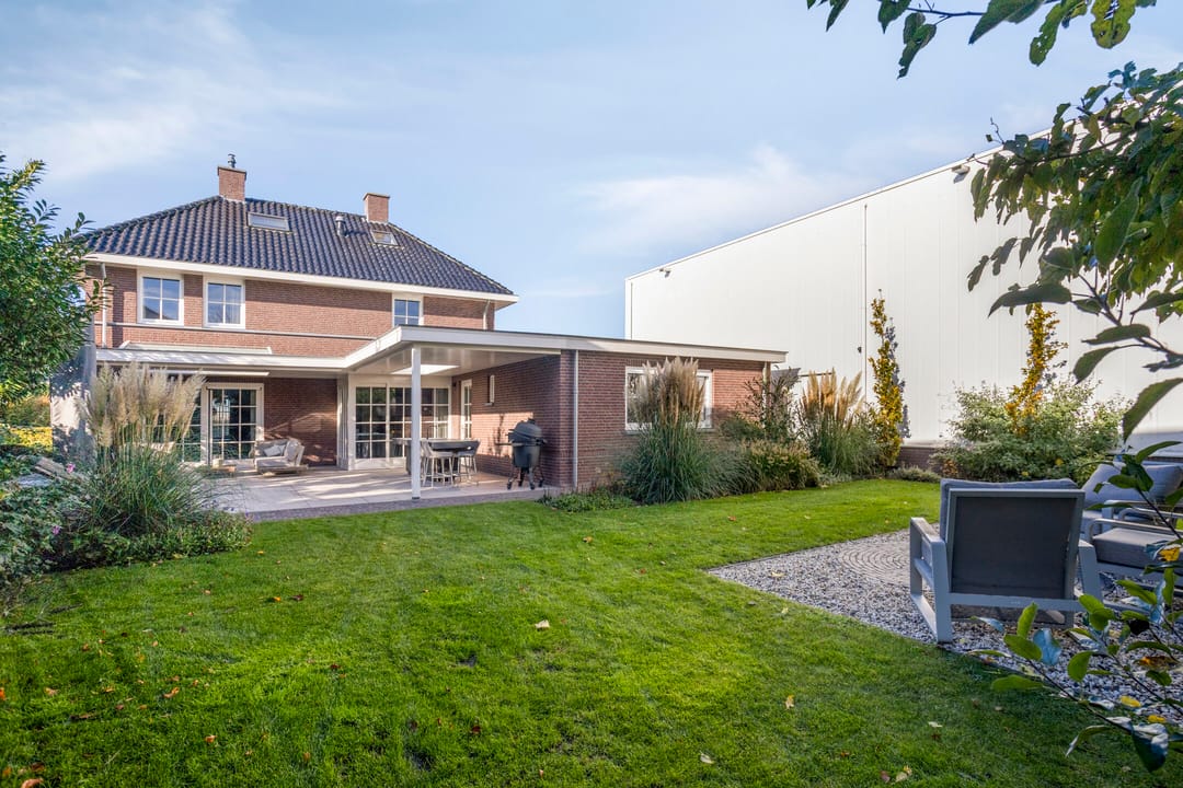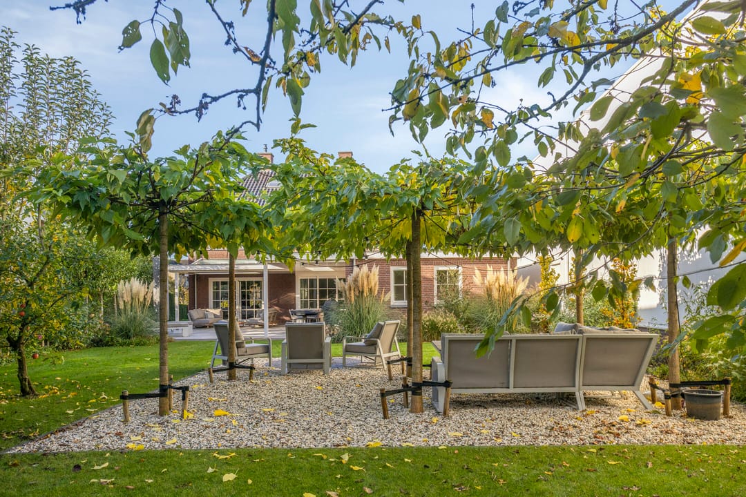 De tuin zelf is aangelegd met gazon, een grindterras met moerbeibomen, borders, diverse (fruit)bomen en computergestuurde automatische beregeningsinstallatie. Aan deze tuin is aandacht besteed!