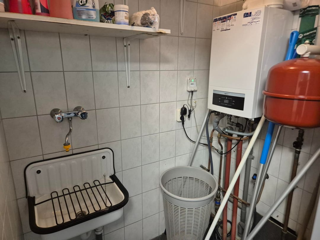 Bij de opslagruimte bevindt zich verder nog een toiletruimte met een wandcloset, een urinoir en een wastafel.