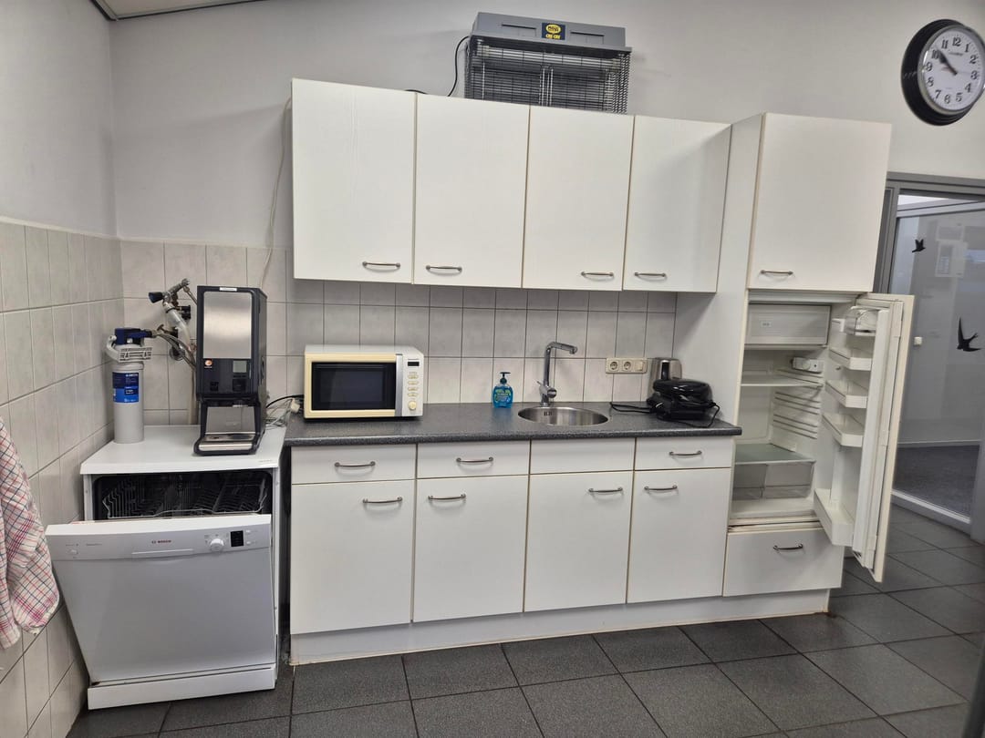 De kantineruimte is groot circa 4.73 x 7.65 meter, met een tegelvloer, systeemplafond met LED-verlichting en een keukenblok met koelkast, een losse vaatwasser en een professioneel koffieapparaat met vaste wateraansluiting.