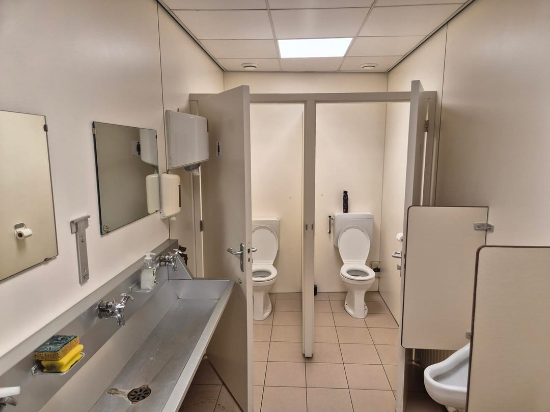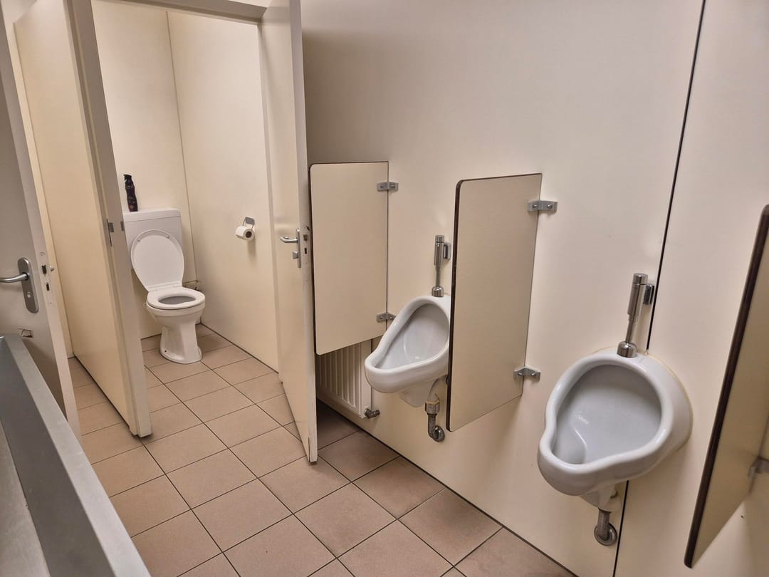 Tenslotte is er een sanitaire ruimte met twee toiletten, twee urinoirs en een roestvrijstalen wasgoot.