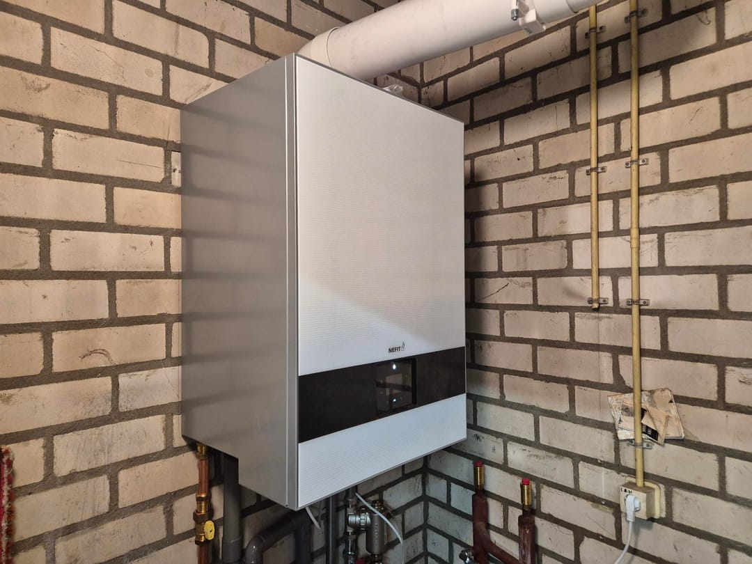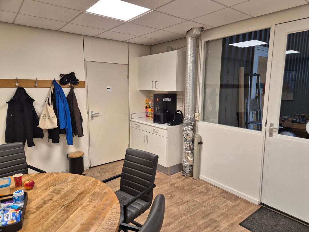 C.v.-ruimte met de gasgestookte Nefit-combiketel. Inpandige kantoorkamer, groot circa 3,40 x 4,50 meter. Kantineruimte, groot circa 4,89 x 4,87 meter met een systeemplafond en een keukenblokje.