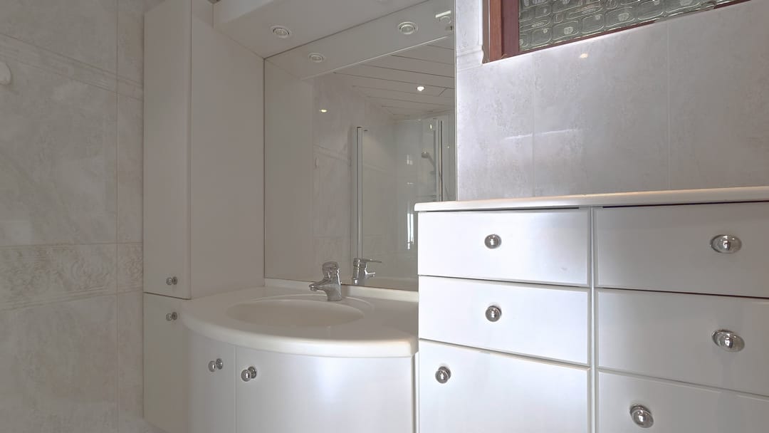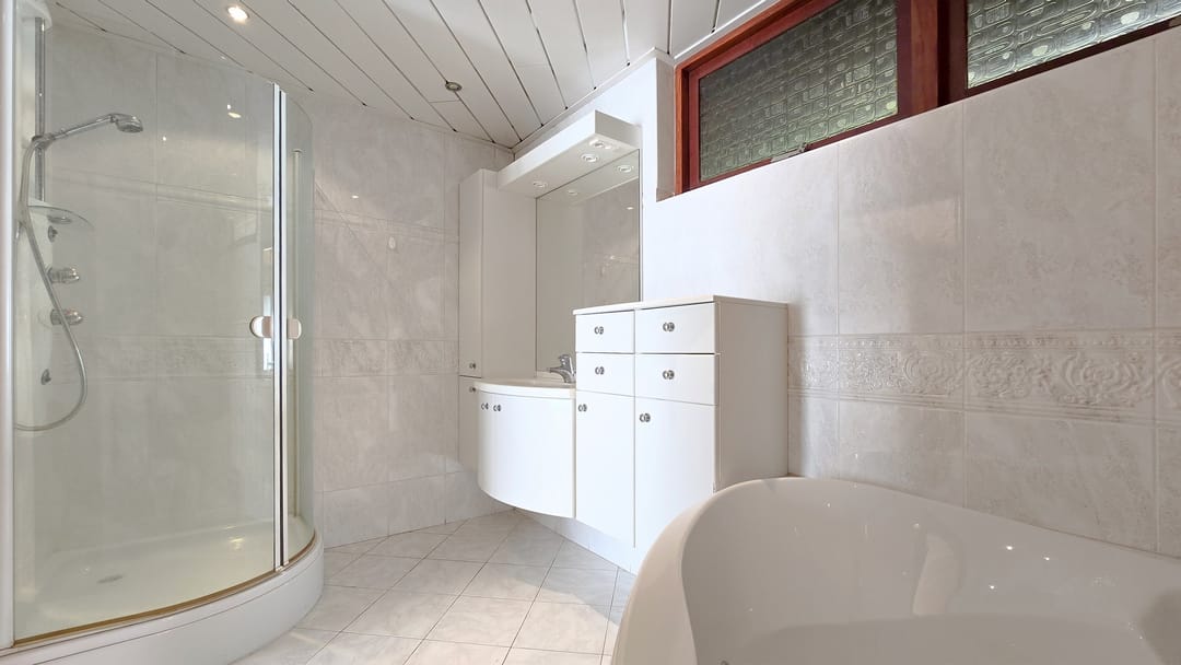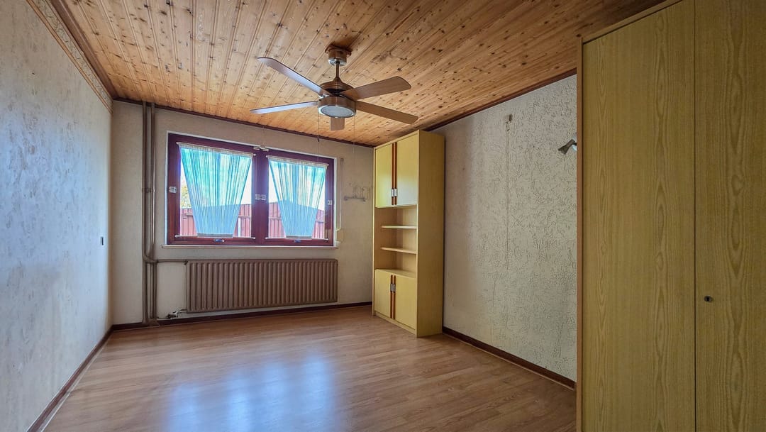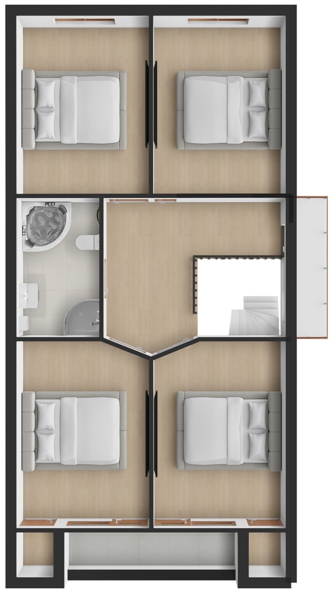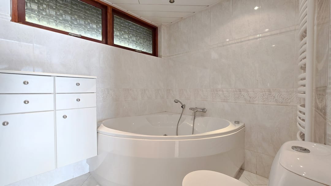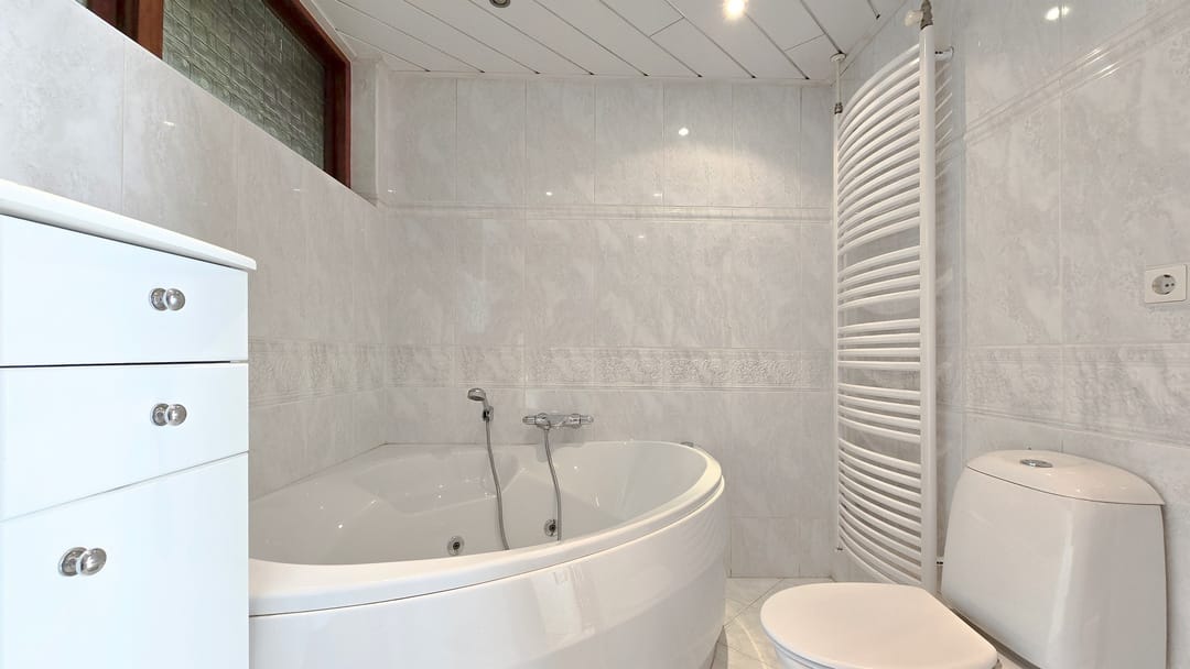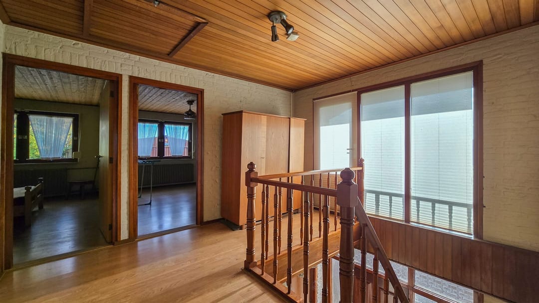 Op de eerste verdieping zijn 4 slaapkamers van elk 14 m² en een badkamer van 7 m² met ligbad, douche, toilet en wastafel met badmeubel.