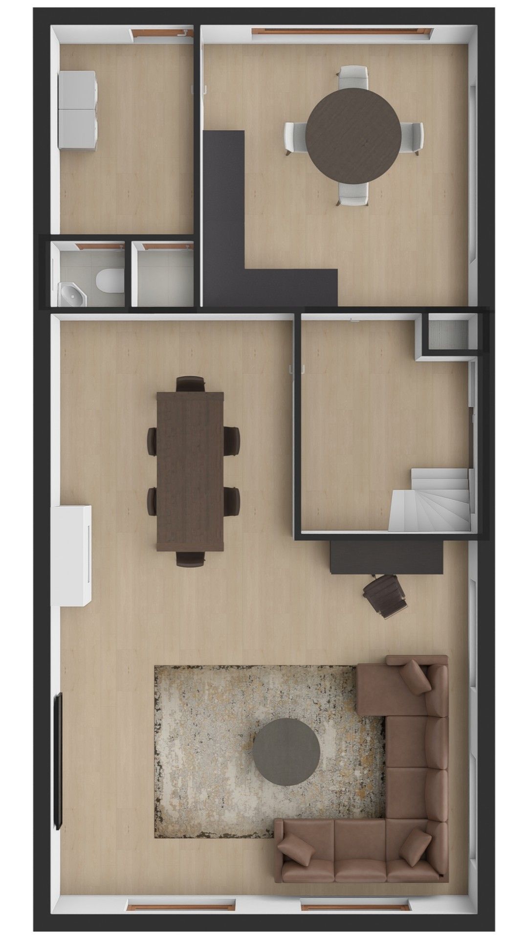 De begane grond heeft een L-vormige living van 49 m², woonkeuken van 18 m² en bijkeuken met separate toiletruimte en bijkeuken van 9 m². Deze verdieping heeft veel lichtinval dankzij grote raampartijen, een schouwpartij in de woonkamer en de woonkeuken heeft een hoekkeuken met granieten blad en inbouwapparatuur.