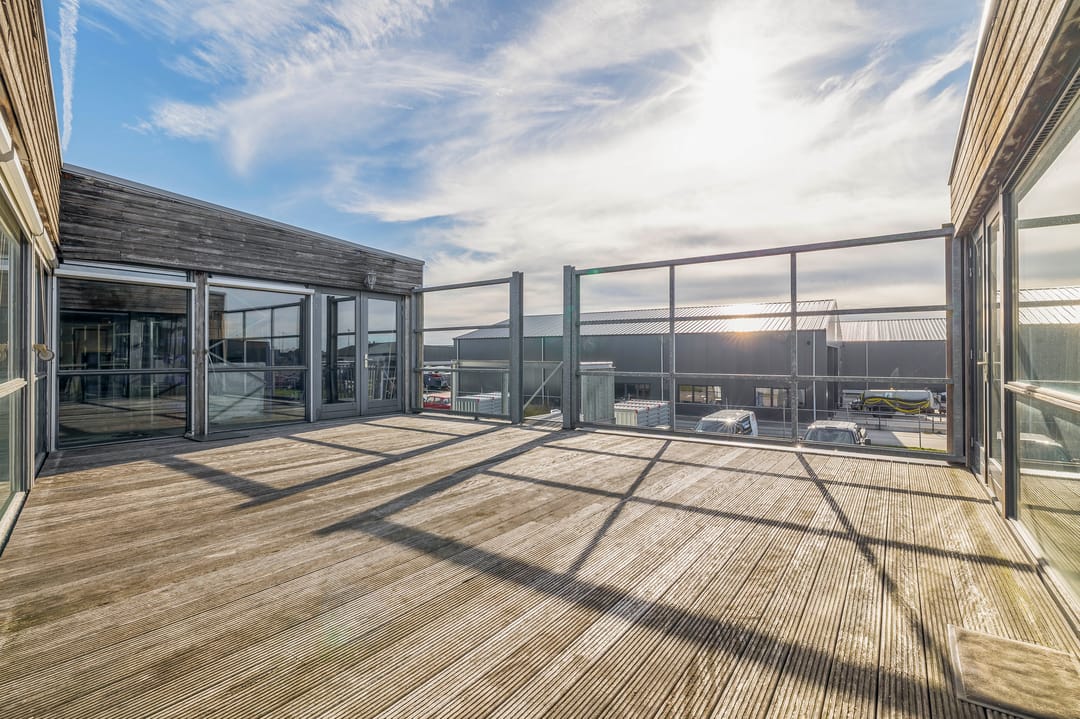 Op de eerste verdieping bevindt zich een hal met toegang tot drie ruime kantoorruimtes van circa 24 m², 43 m² en 45 m². Daarnaast is er een royaal dakterras van circa 50 m² aanwezig en zijn er meerdere toiletruimtes.