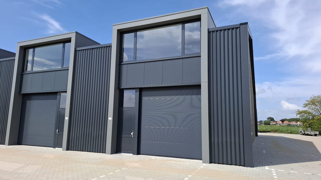 De gevels zijn voorzien van geïsoleerde sandwichpanelen met een moderne industriële uitstraling. De aluminium gevelelementen zijn standaard uitgevoerd met HR++ beglazing en zijn gemonteerd in wit gegronde houten stelkozijnen. Elke unit beschikt over een handbediende overheaddeur met geïntegreerde loopdeur.