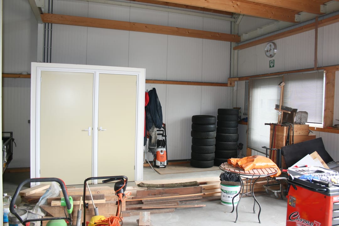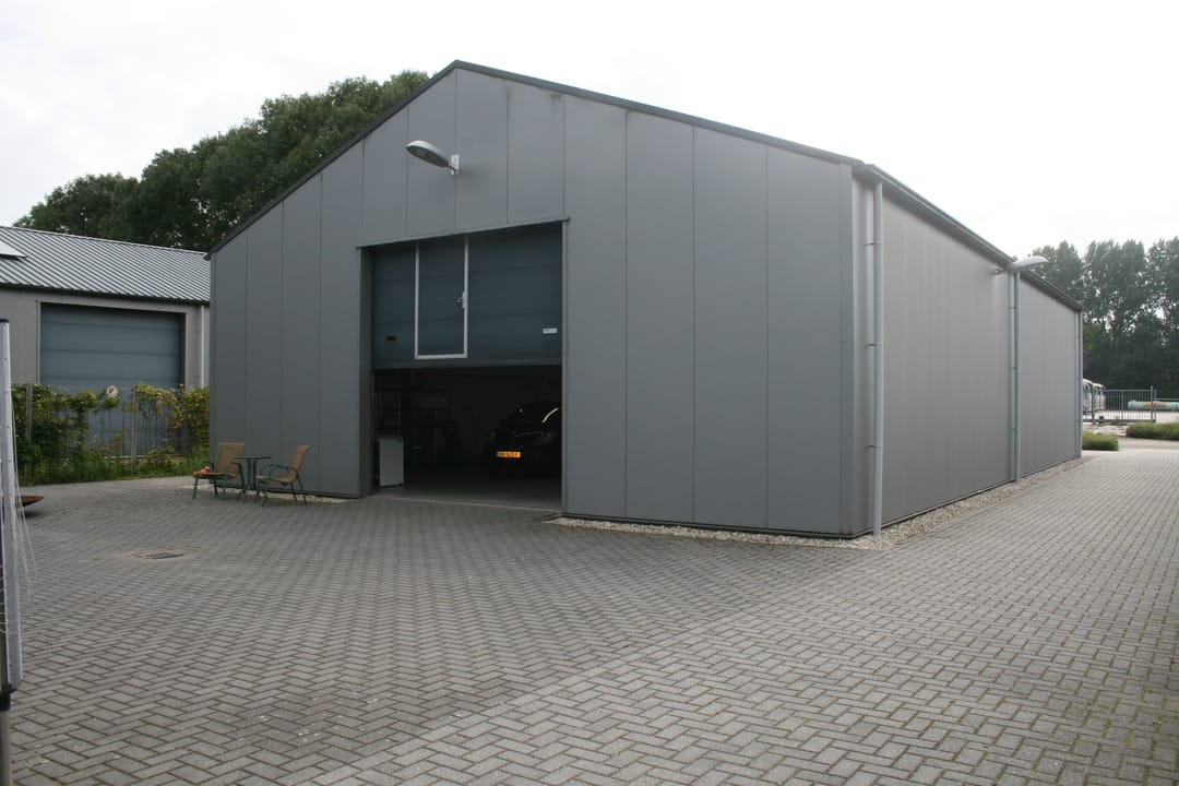 De toegangen van de hal aan de voorzijde bestaan uit een overheaddeur van 3.00 x 3.00 m en is er bovendien een afzonderlijke loopdeur die de toegankelijkheid vergroot.