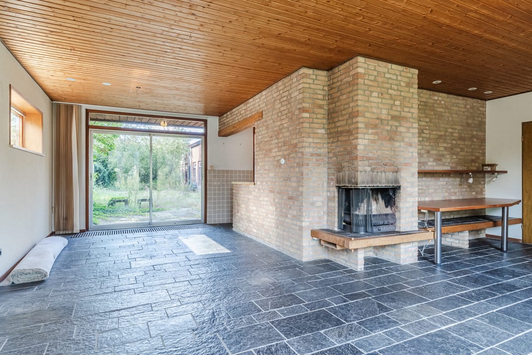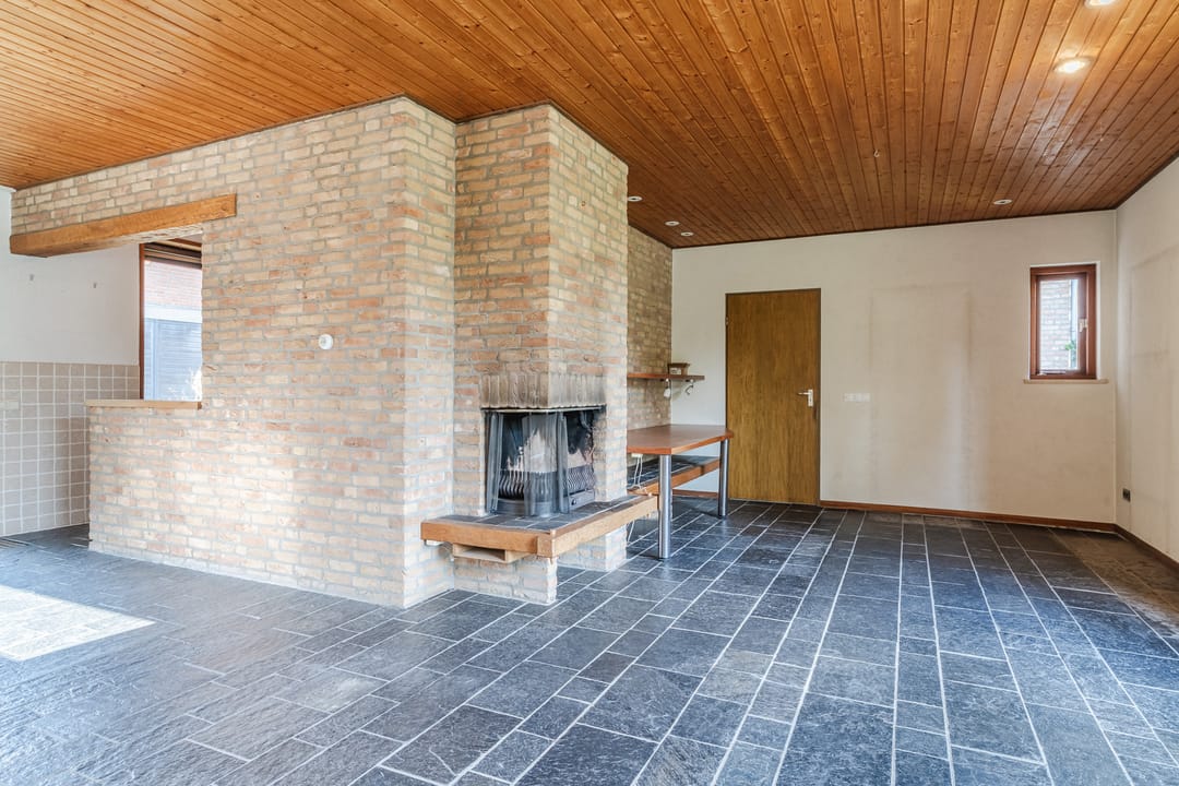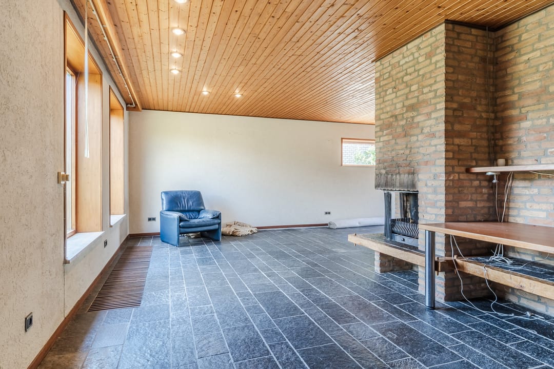 Zeer royale woonkamer (ca. 40 m²) voorzien van tegelvloer, spotverlichting, convectorputten, open haard, schuifpui naar het terras en tuin en toegang tot de deels in open verbinding staande woonkeuken.