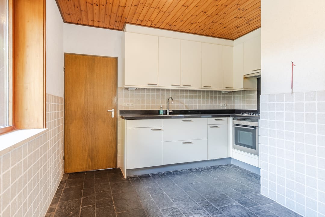 Riante woonkeuken voorzien van tegelvloer uitgerust met spoelbak, koelkast, 6-pits gaskookstel, oven, afzuigkap, bergkasten en toegang tot de kelder en hal.