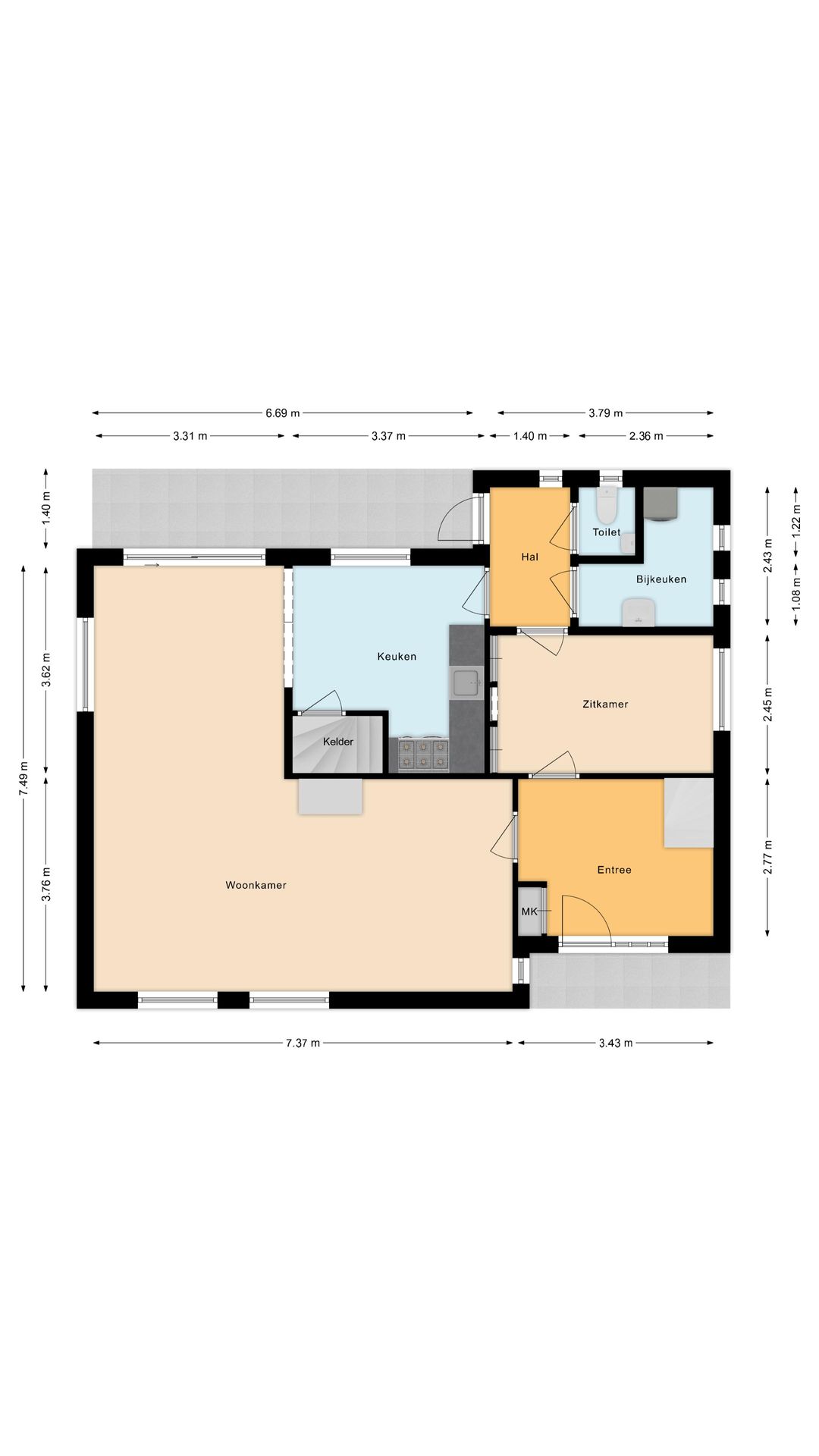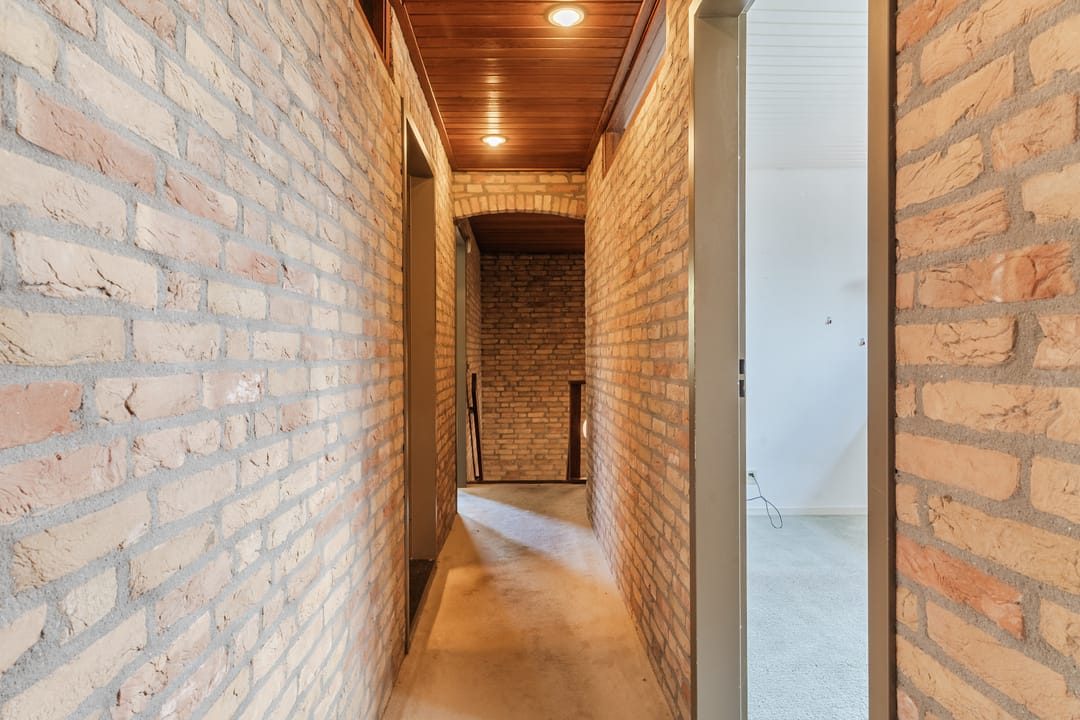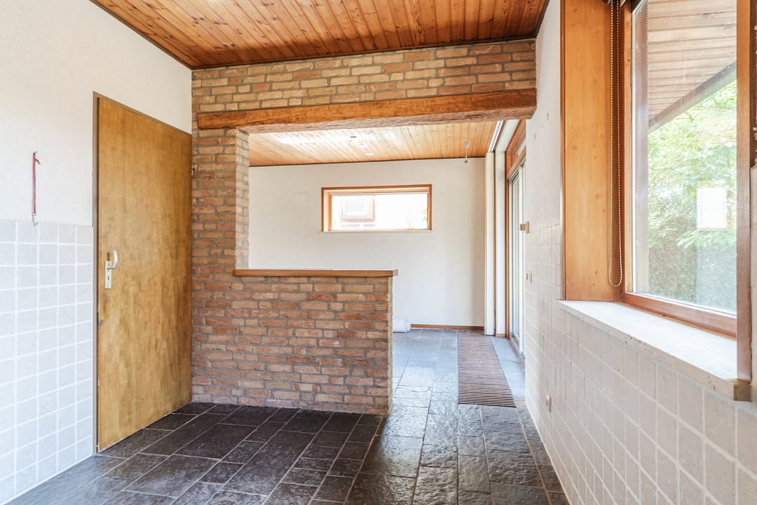 Hal voorzien van tegelvloer en toegang tot toilet, bijkeuken en zitkamer.