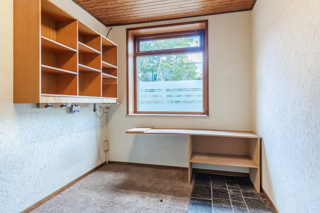 Zitkamer voorzien van tegelvloer en bergkasten.