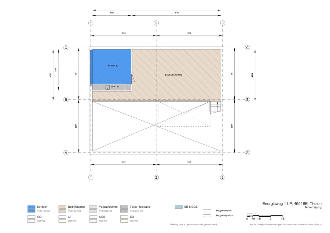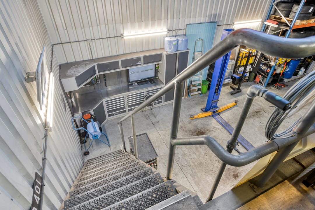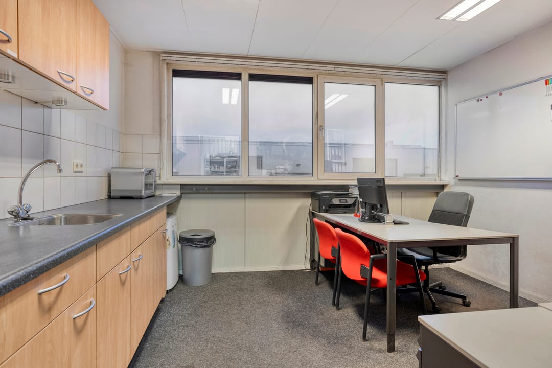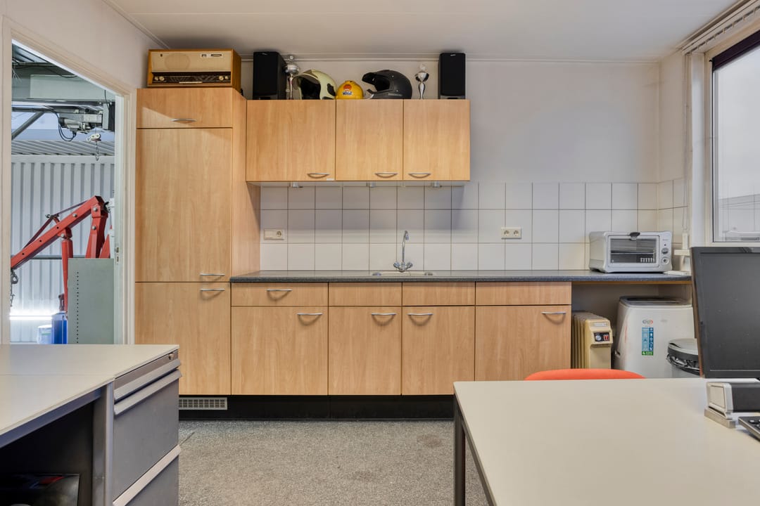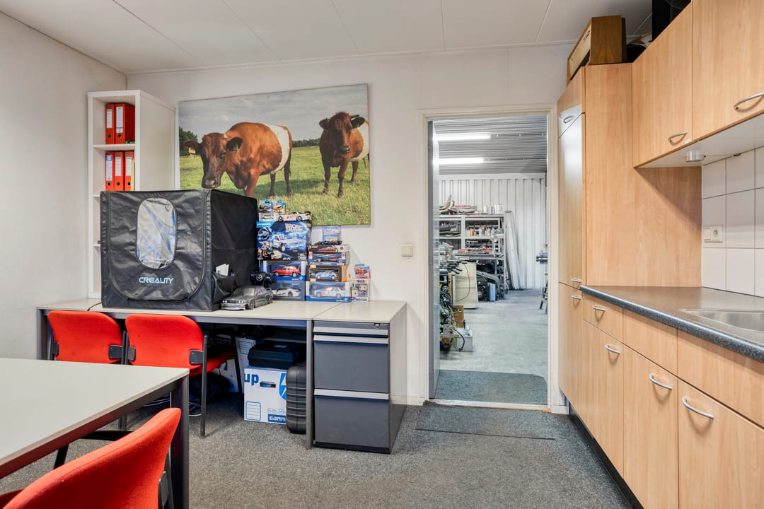 De eerste etage is bereikbaar via een vaste stalen trap. Hier bevindt zich een ruime zolderverdieping die is ingericht als kantoorruimte. De kantoorruimte is voorzien van een keuken, wat deze verdieping uitermate geschikt maakt voor administratieve werkzaamheden of als aanvullende werkruimte.