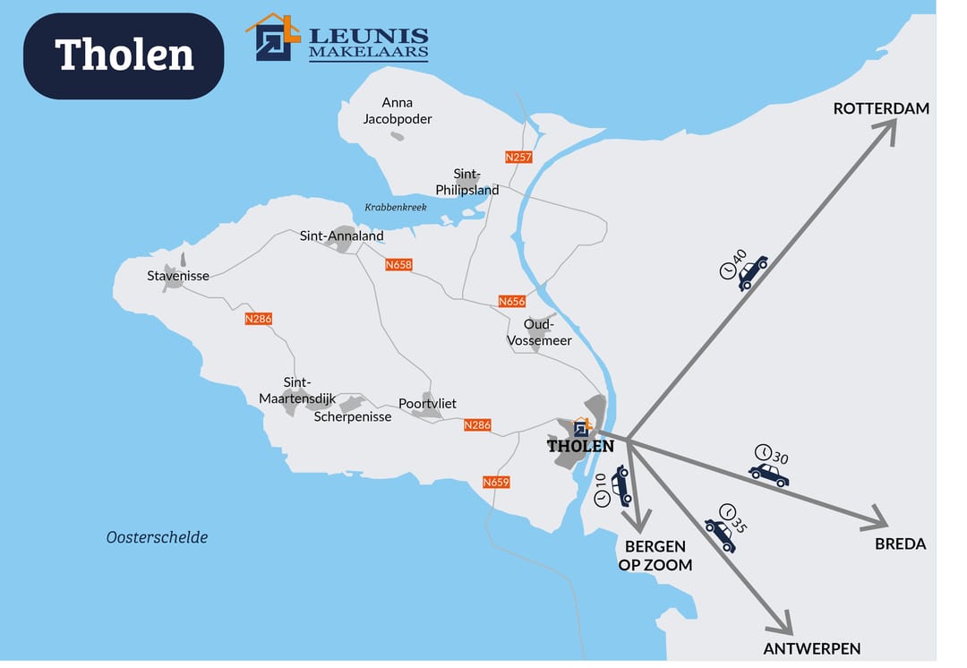 De unit bevindt zich op een gunstige locatie in Tholen, met uitstekende verbindingen naar belangrijke steden en regio’s. Dankzij de nabijheid van grote uitvalswegen zijn steden als Rotterdam, Breda, Vlissingen en Antwerpen binnen 10 minuten bereikbaar. Dit maakt de locatie ideaal voor zowel klanten als medewerkers.