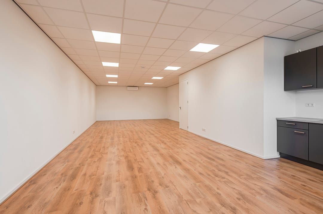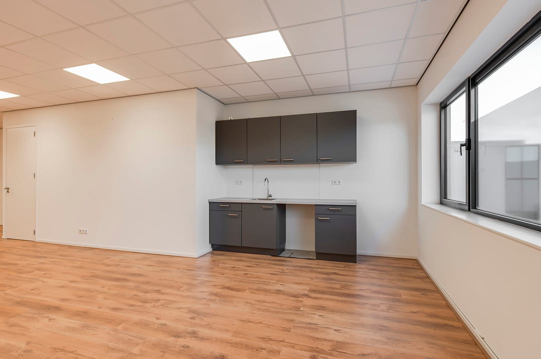 De verdiepingsvloer is voorzien van een pantry, strakke wandafwerking met glasvezelbehang en een systeemplafond met ledverlichting. Hier wordt de ruimte verwarmd en gekoeld middels een airco installatie.