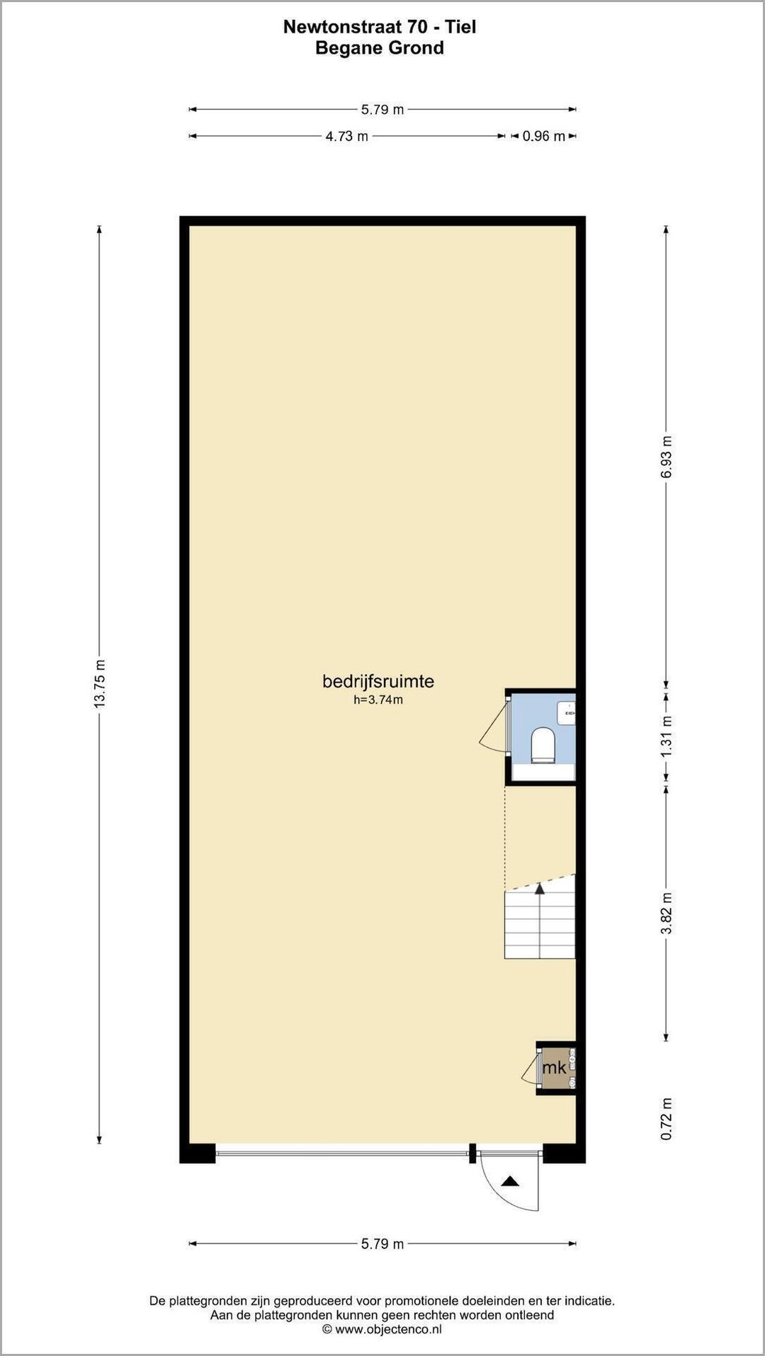 Begane grond: entree middels de loopdeur of de elektrisch bedienbare overheaddeur naar de bedrijfsruimte. In de bedrijfsruimte treft u de meterkast, trapopgang naar de verdieping en een toilet. Verwarming middels infrarood panelen.