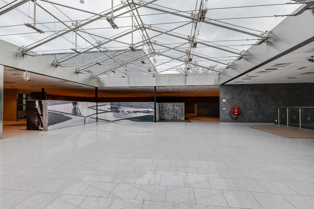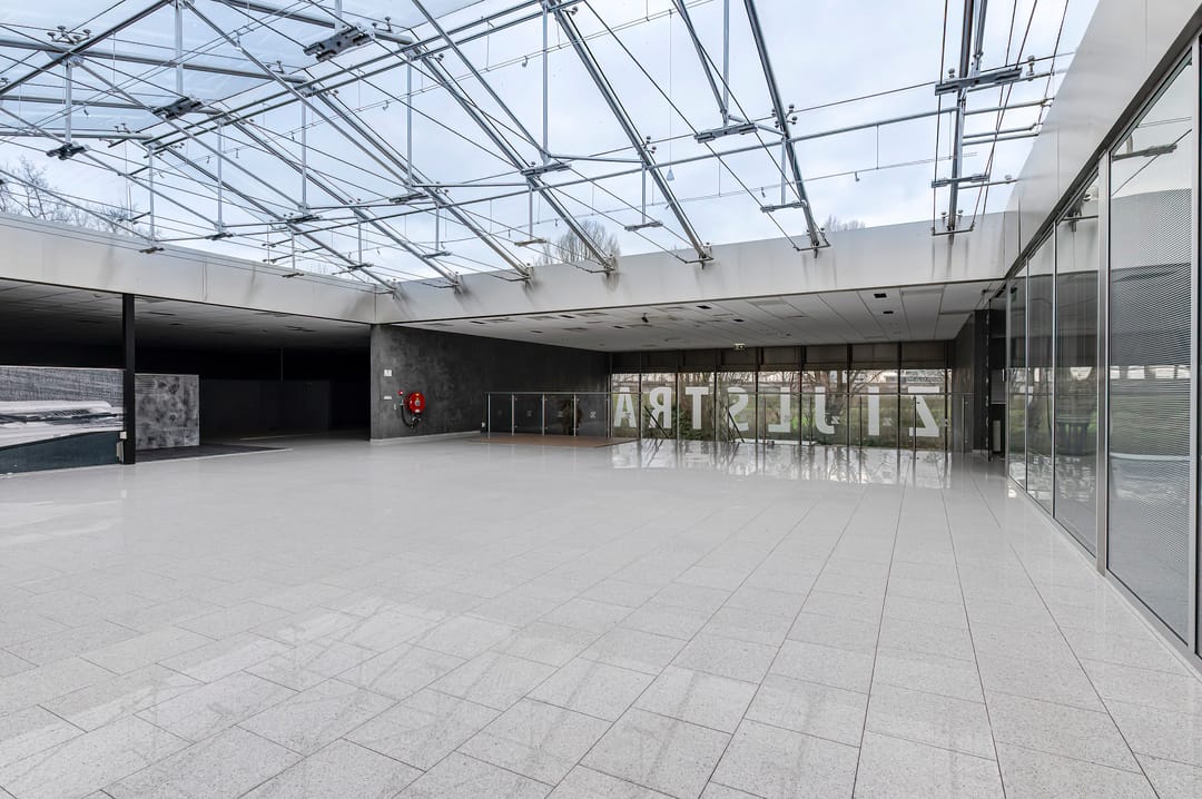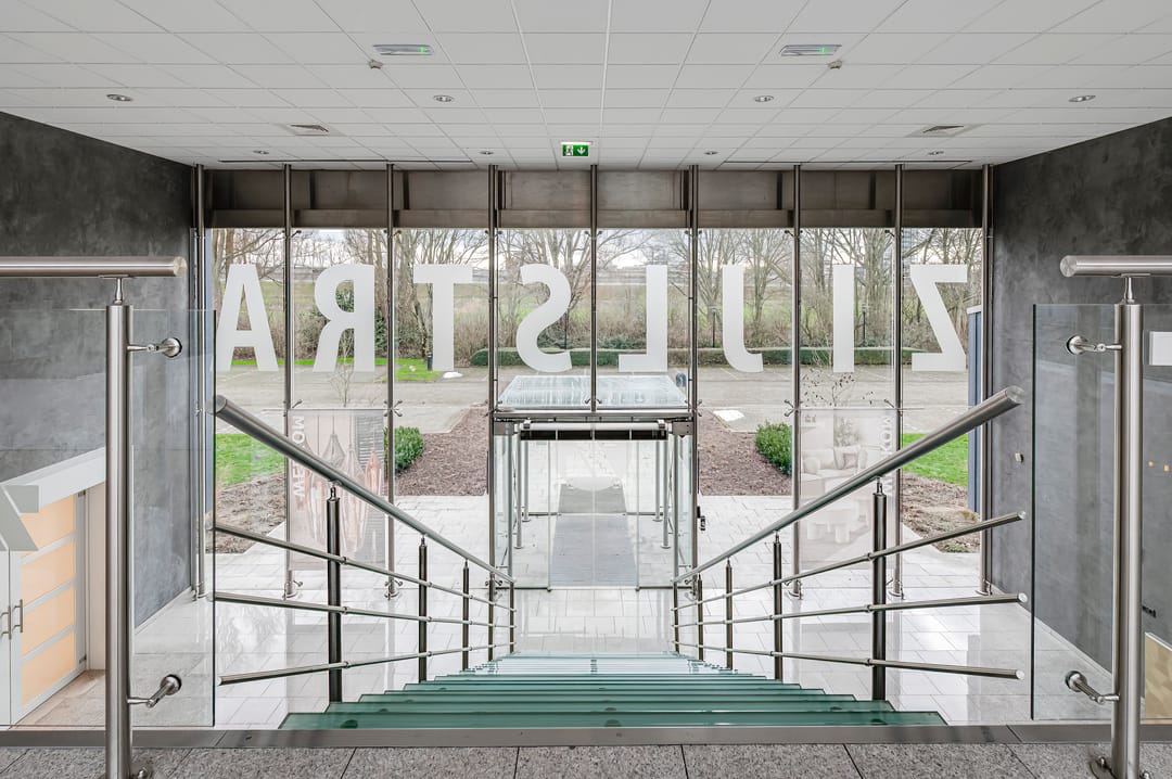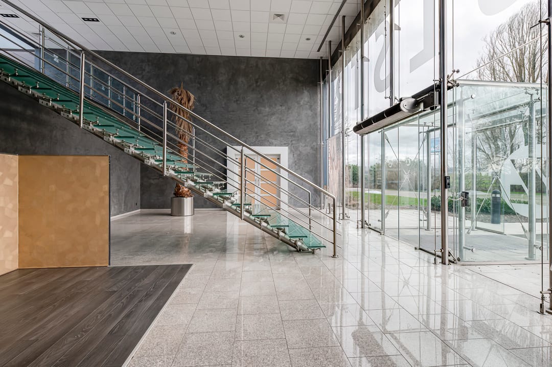 - Entree aan de zijkant van het gebouw met fraaie glasgevel, ontvangstruimte en receptie, rechts hiervan een showroom/presentatieruimte
