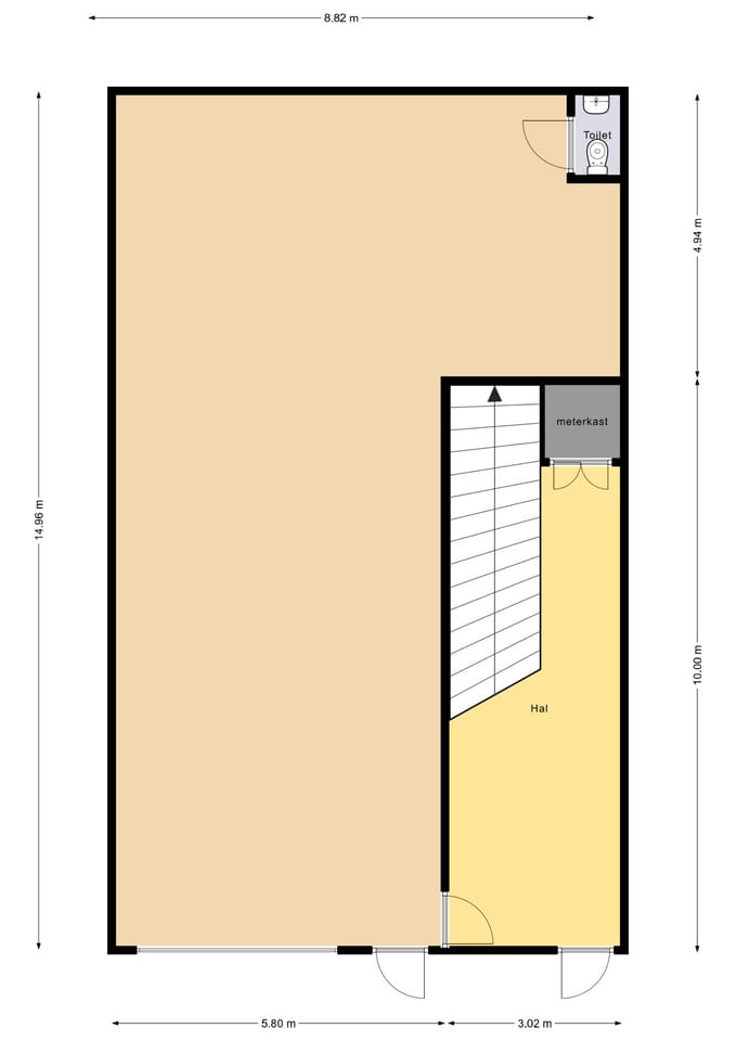Begane grond: bedrijfsruimte met brede overheaddeur voor gemakkelijke doorgang, toilet achterin de bedrijfsruimte.