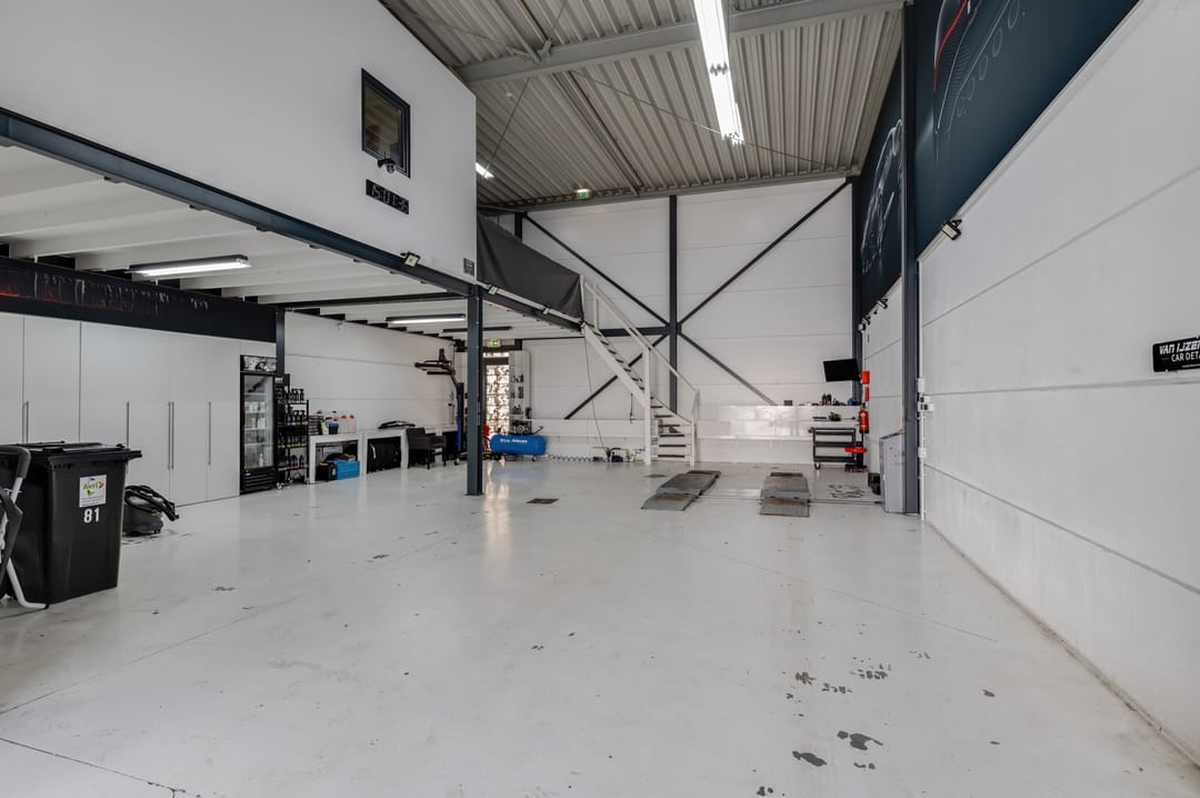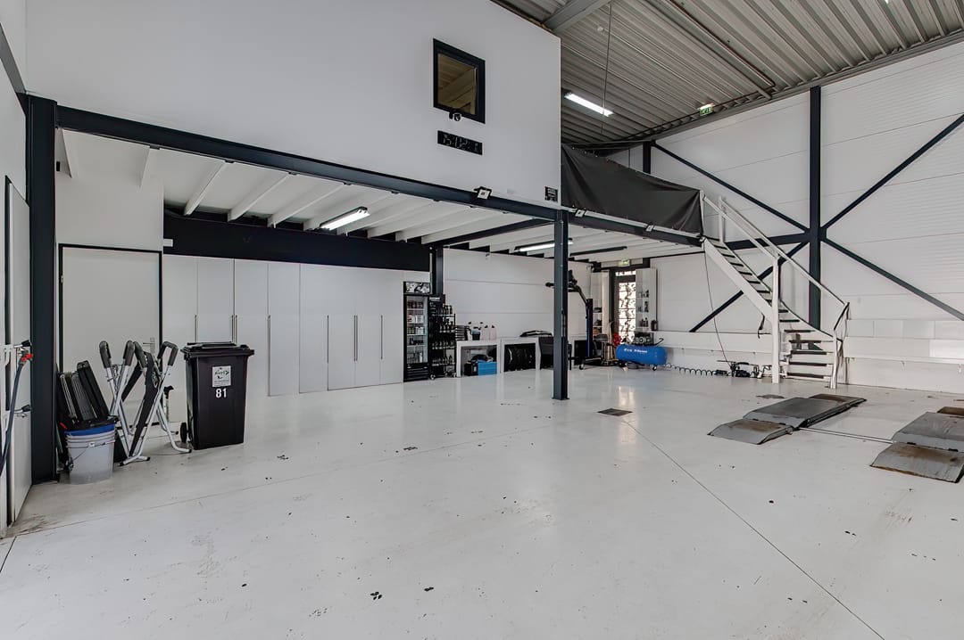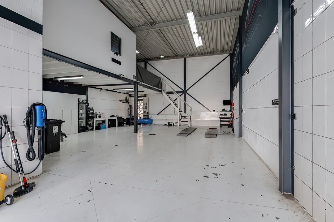 Entree middels loopdeur, hal met toilet, meterkast en trapopgang, kantoor of kantine met keukenblok. De bedrijfsruimte is toegankelijk via de overheaddeur van 4.60 x 4 meter of vanuit de kantoorruimte, beschikt over een kastenwand, betonvloer met afvoerput voorzien van afwateringssysteem en gedeeltelijk een verdiepingsvloer t.b.v. extra opslagruimte. In de bedrijfsruimte zit in de achtergevel een deur naar een terras. De op de foto's getoonde autobrug is inmiddels verwijderd.