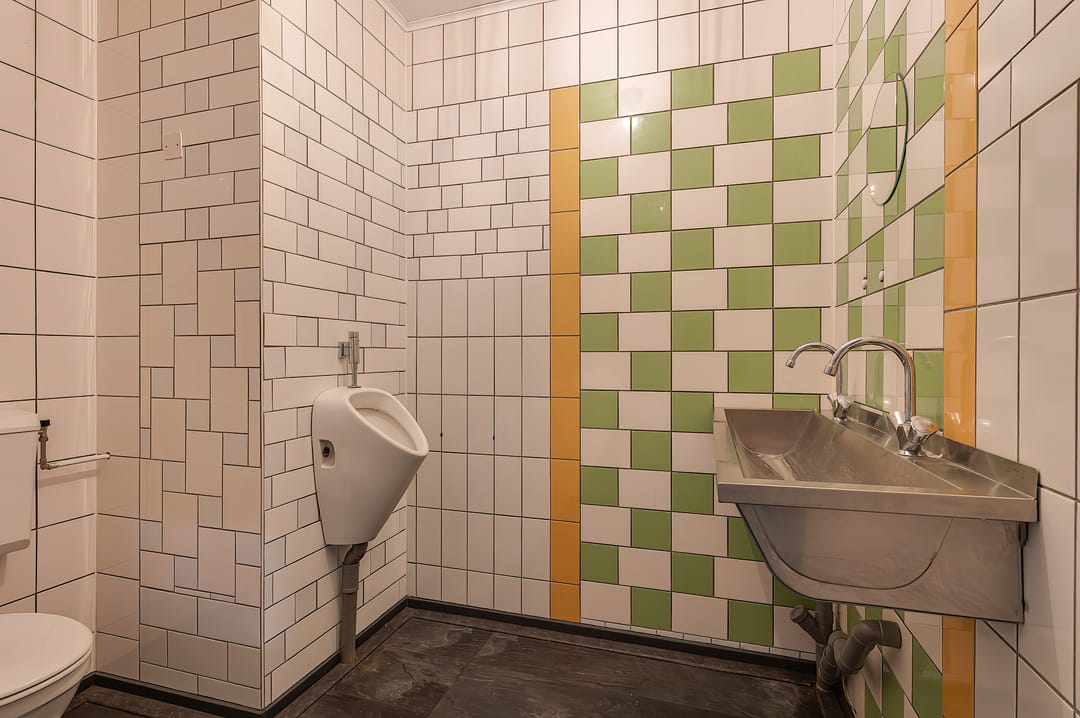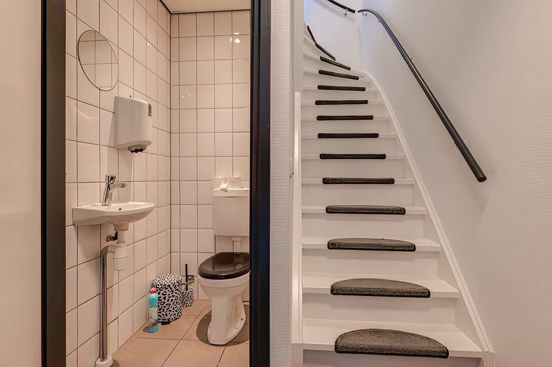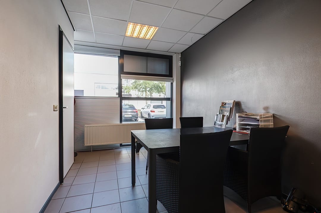 Kantoor met toegang naar kantine met toiletruimte met urinoir, separaat toilet en wasbak, entresolvloer bedrijfsruimte met trap naar de bedrijfsruimte op de begane grond.