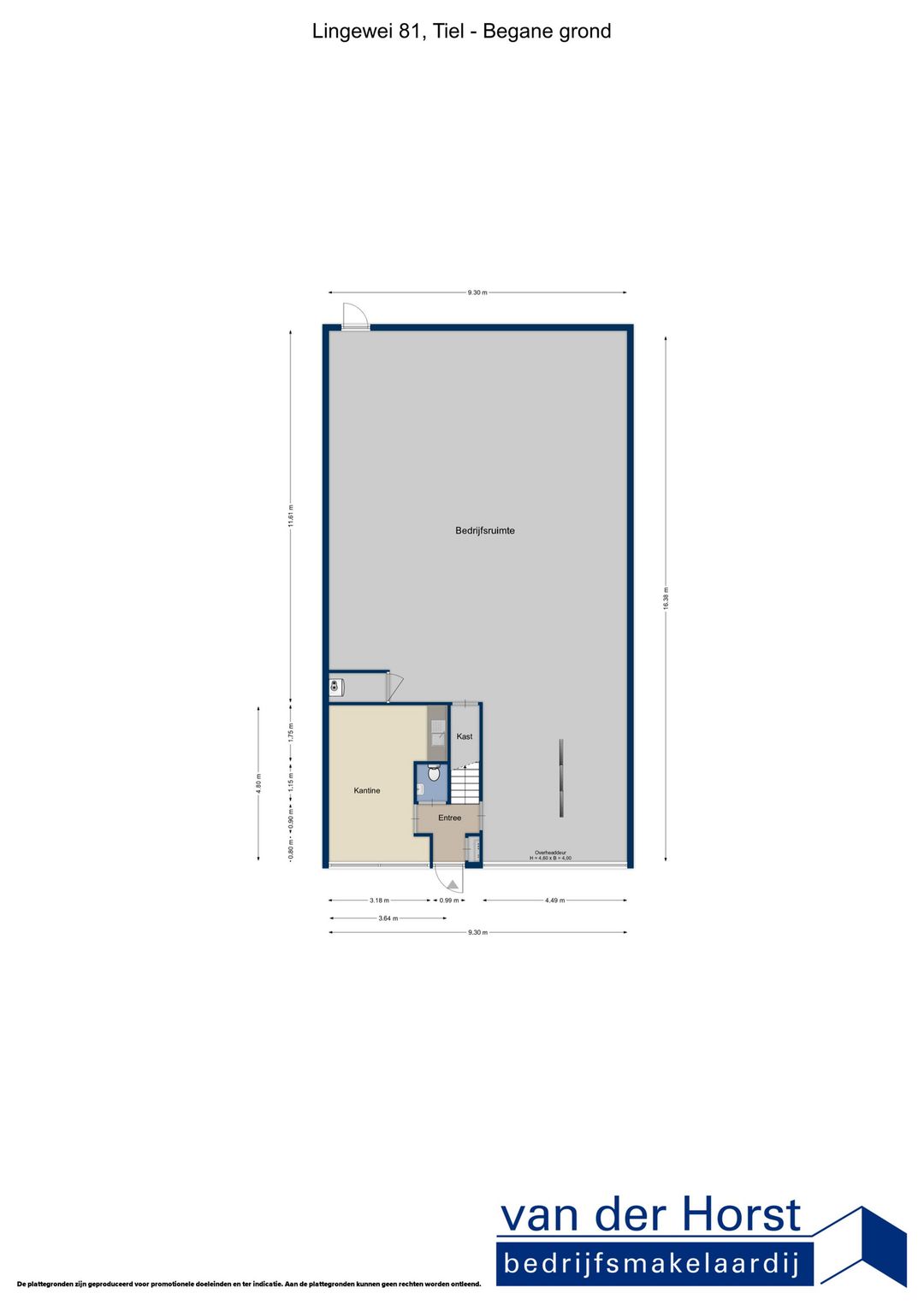 De begane grond heeft een oppervlakte van ca. 151 m², bestaande uit een bedrijfsruimte van ca. 132 m² groot, een kantoor / kantine van ca. 16 m² met entree, toilet en opgang naar de verdieping.