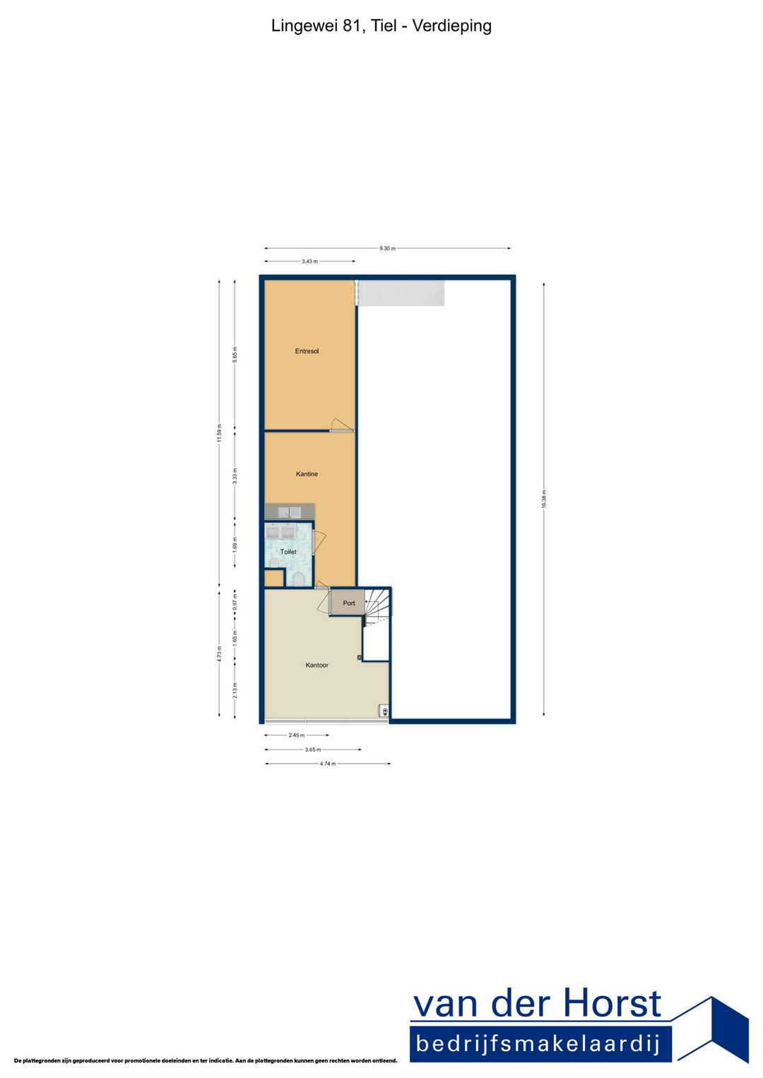 De verdieping heeft een oppervlakte van ca. 59 m², omvattende een kantoorruimte van ca. 20 m², kantine met toiletruimte van ca. 20 m² en entresolvloer van ca. 19 m².