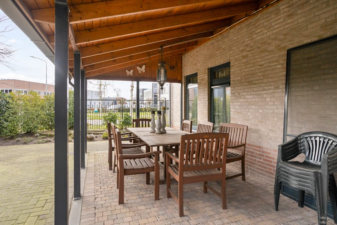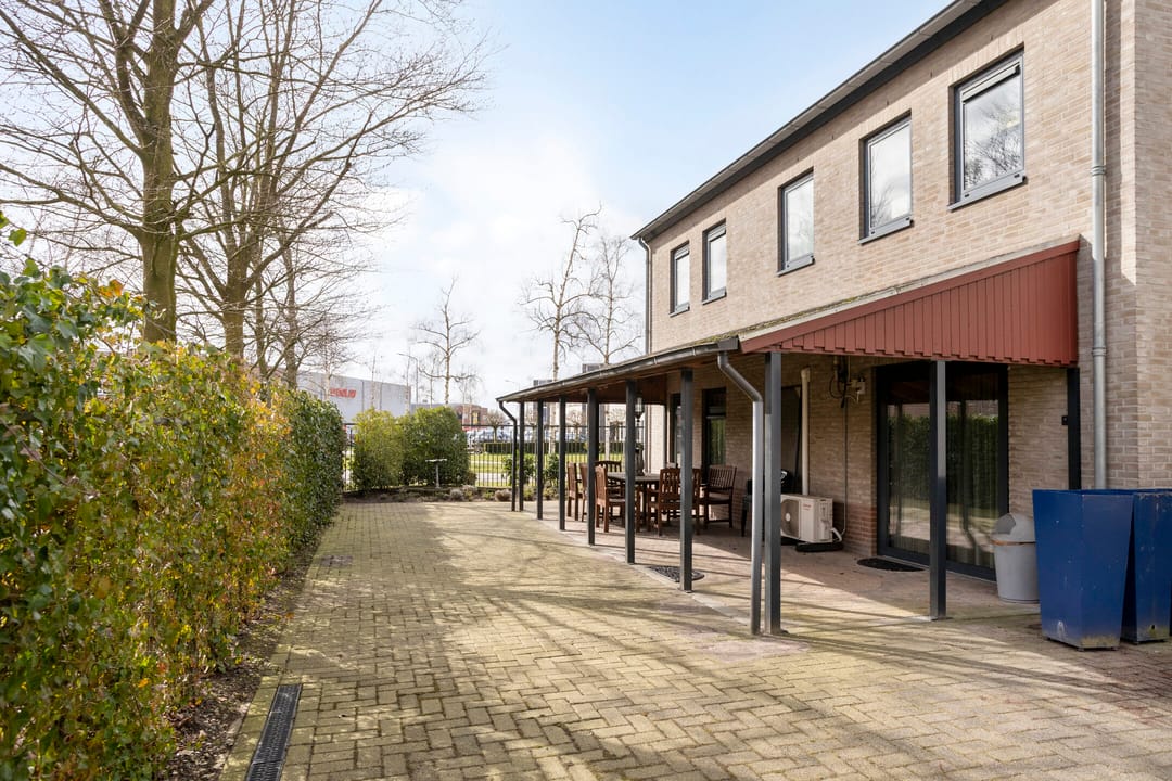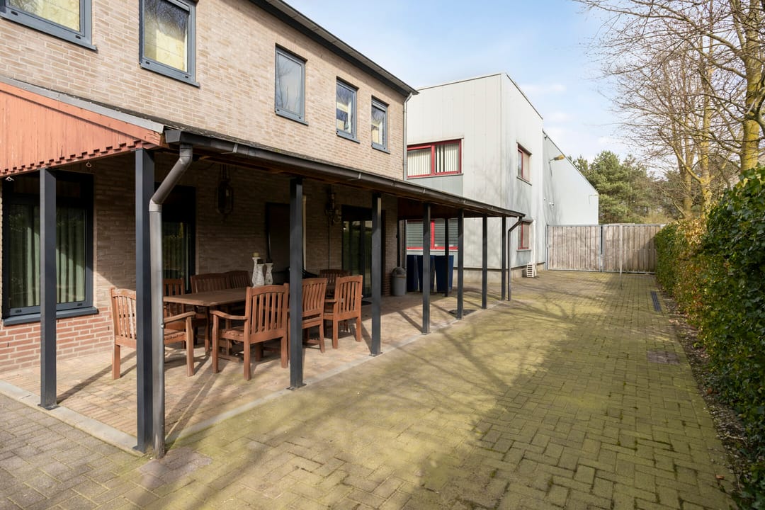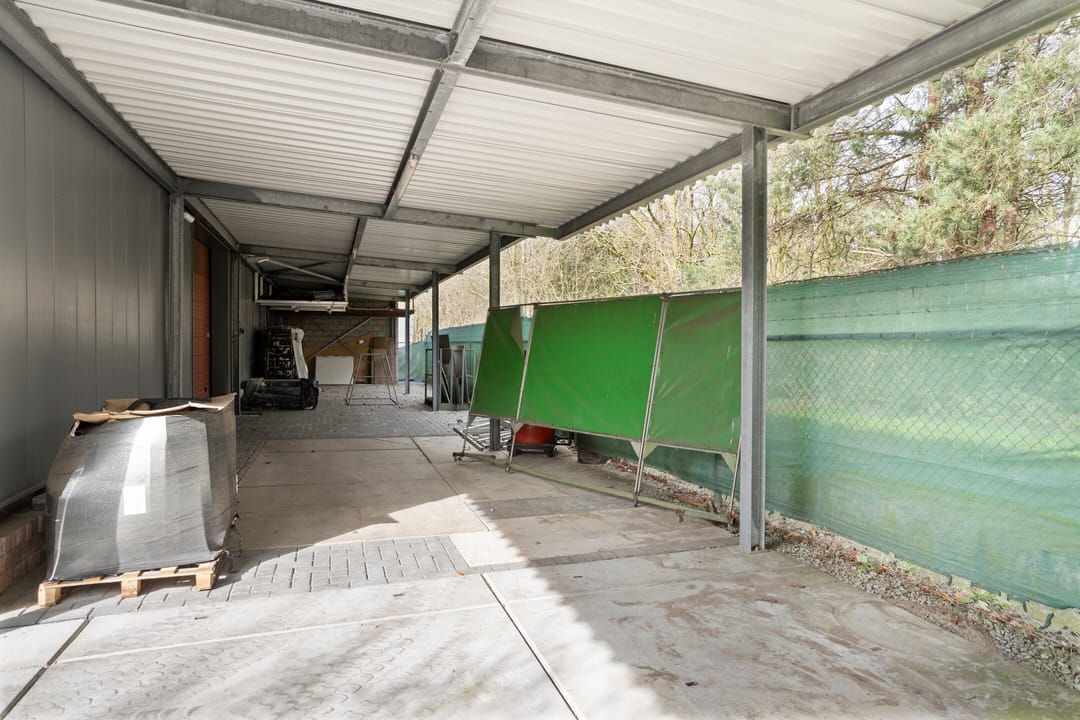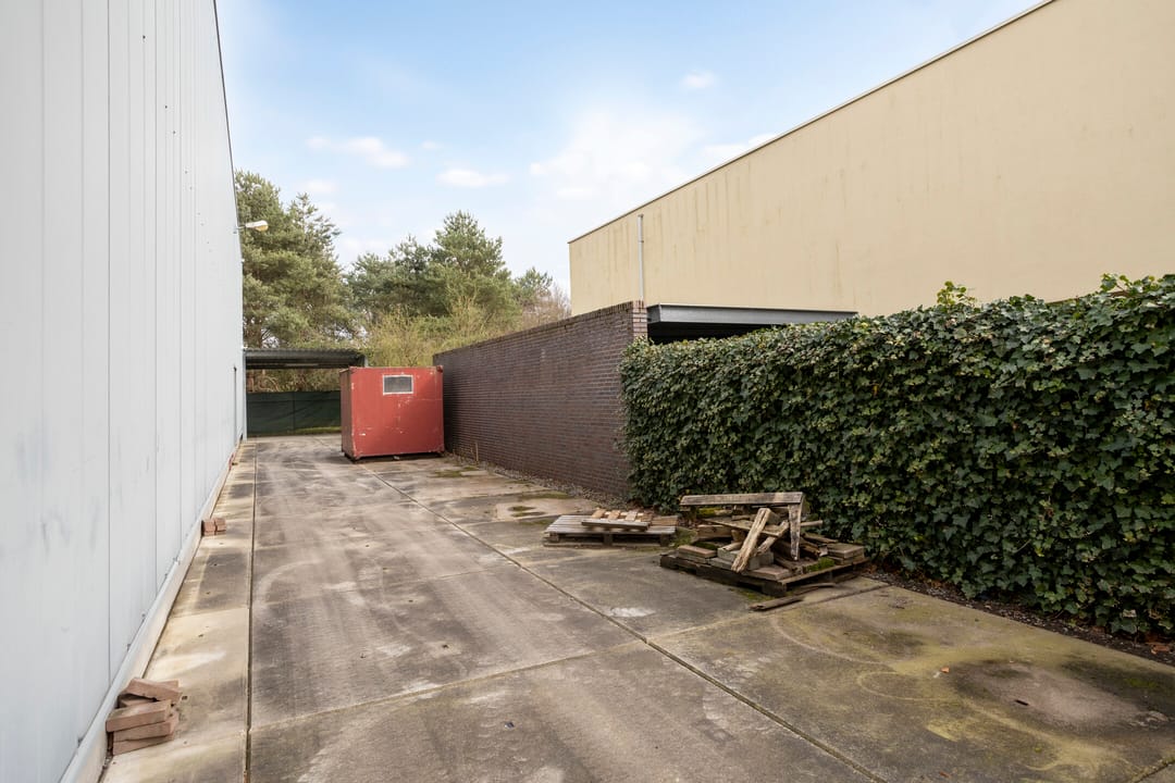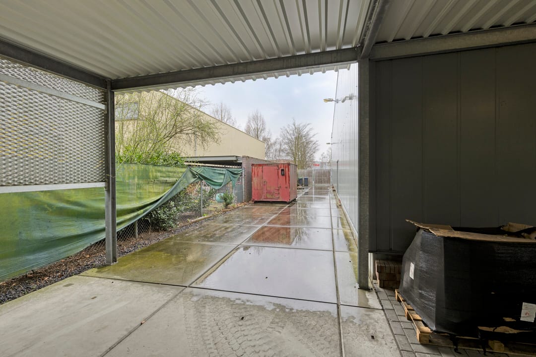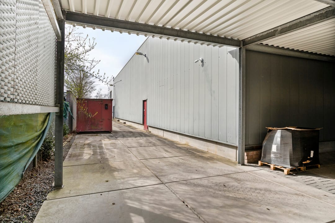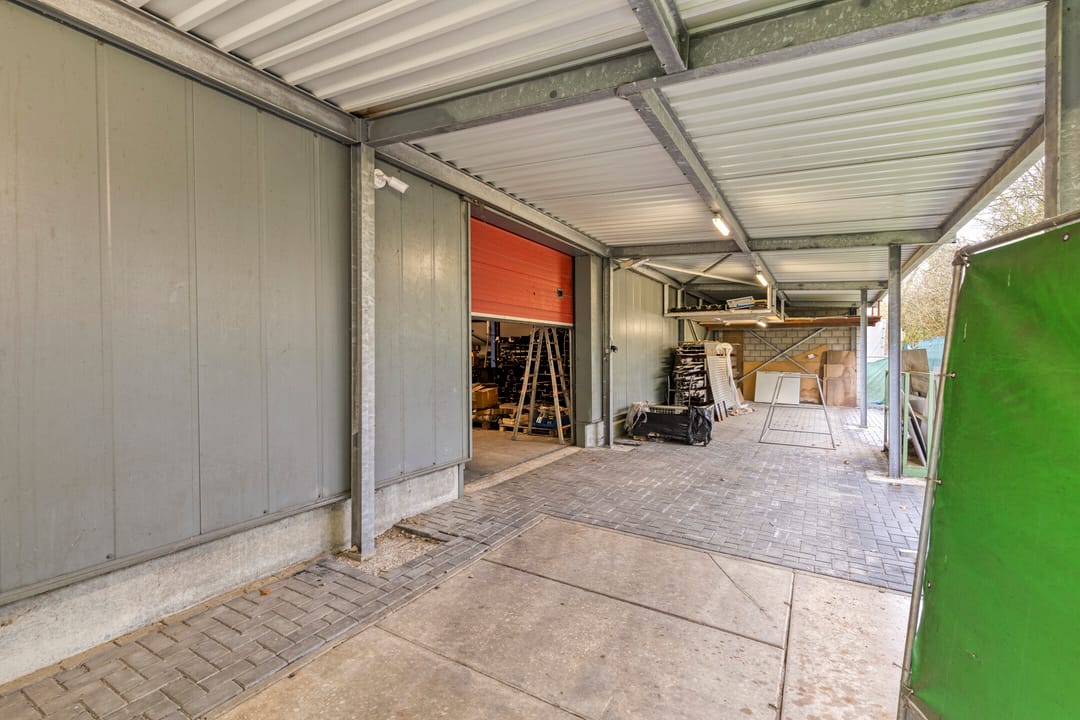 Het buitenterrein is geheel verhard met betonklinkers en betonplaten. Aan de voorzijde is een stalenhekwerk met stalen toegangspoort. Achter de hal is nog een flinke overkapping gebouwd. Ideaal voor het droog stallen van materiaal en/of materieel.