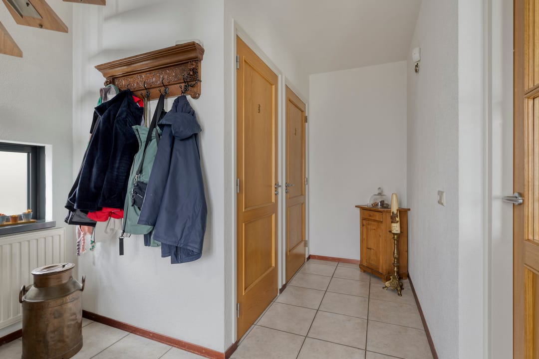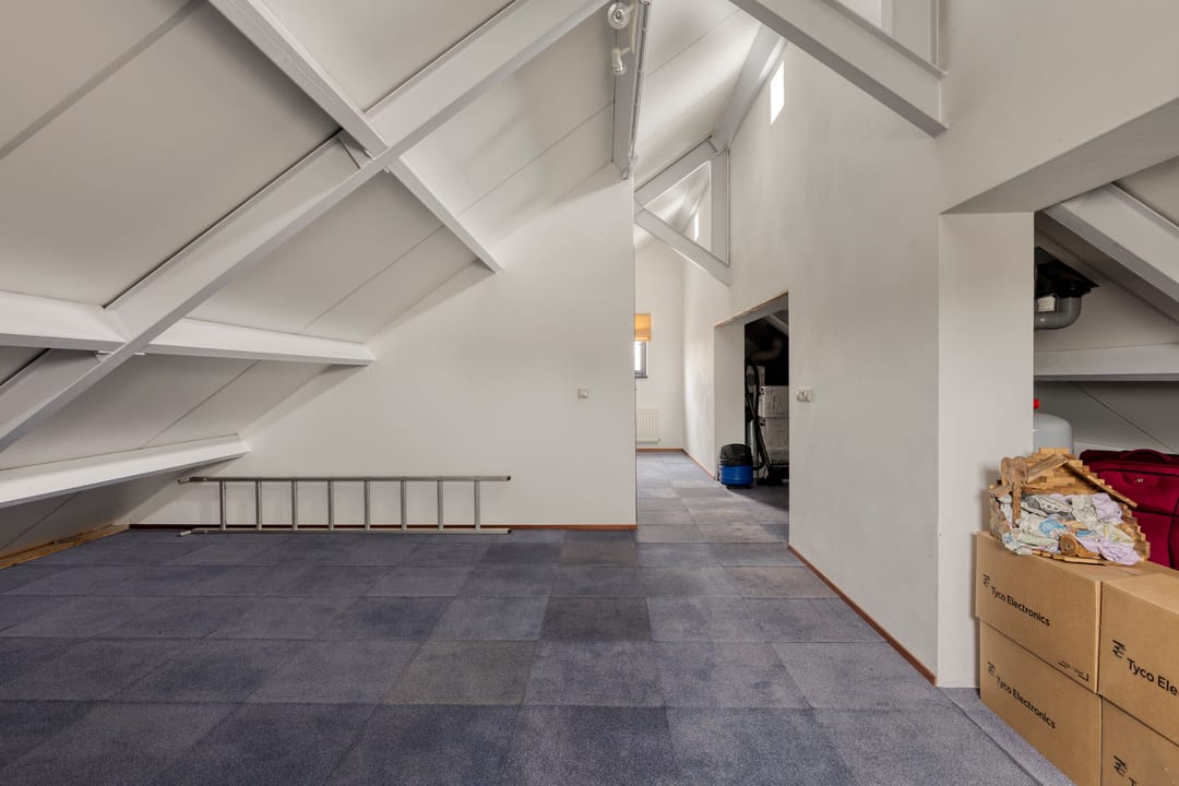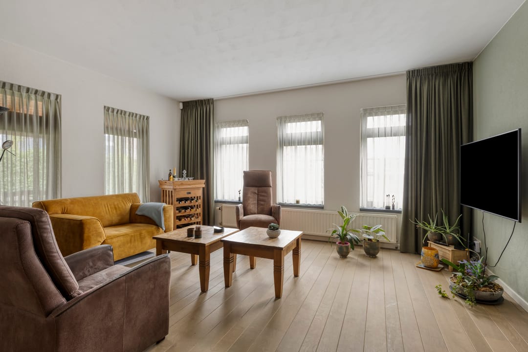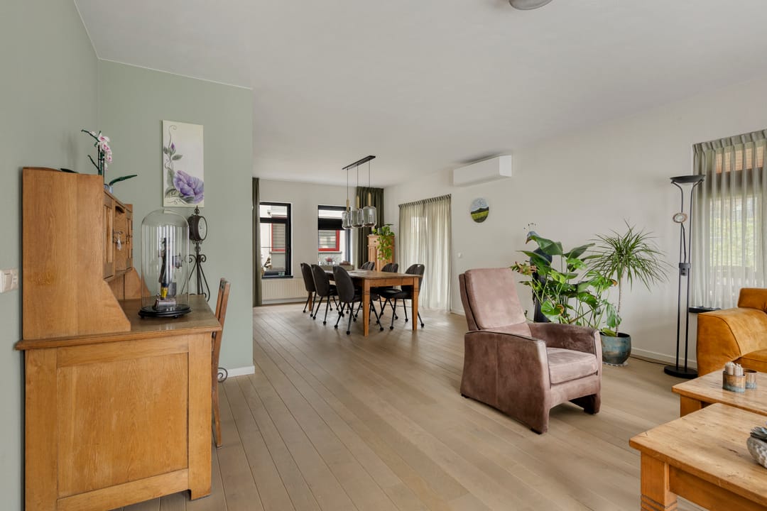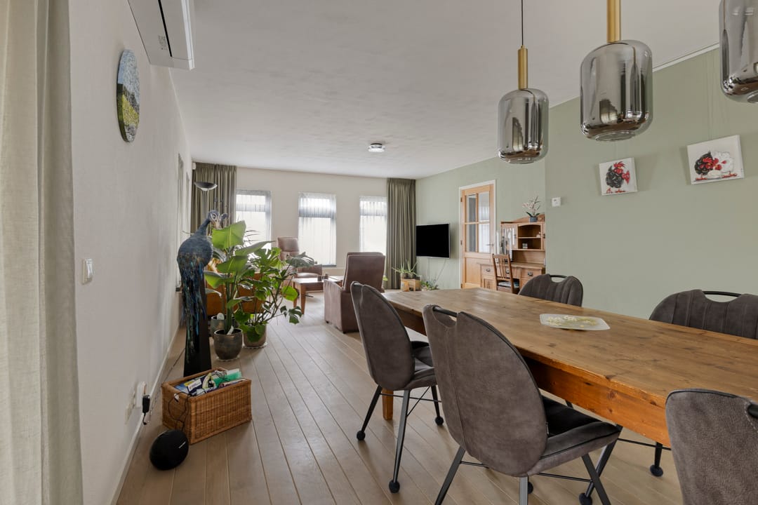 Begane grond met ruime hal, toiletruimte, urinoirruimte, woonkamer met houten vloer, airco en openslaande deuren naar een grote veranda en verharde tuin, woonkeuken met nette complete inrichting voorzien van koelkast, combi oven/magnetron, inductiekookplaat en vaatwasser, bijkeuken met witgoedaansluitingen, meterkast en buitendeur naar het verharde erf. Op de 1e verdieping is een overloop met separate toiletruimte, 3 slaapkamers en een badkamer voorzien van ligbad, douche en dubbele wastafel met meubel. Via een vaste trap is toegang tot de 2e verdieping. Hier is een grote open ruimte met zolderkamer, bergruimte en opstelling van de cv.-ketel. De tuin bij de woning is veelal gelegen aan de voorzijde en rechterzijde van de woning. Er is een grote veranda aangebouwd van circa 24 m².