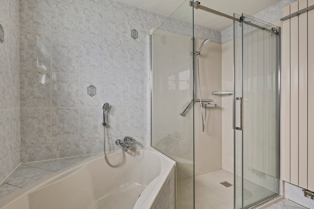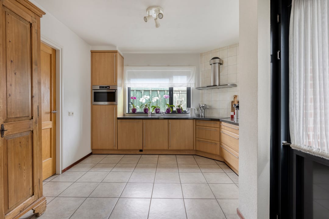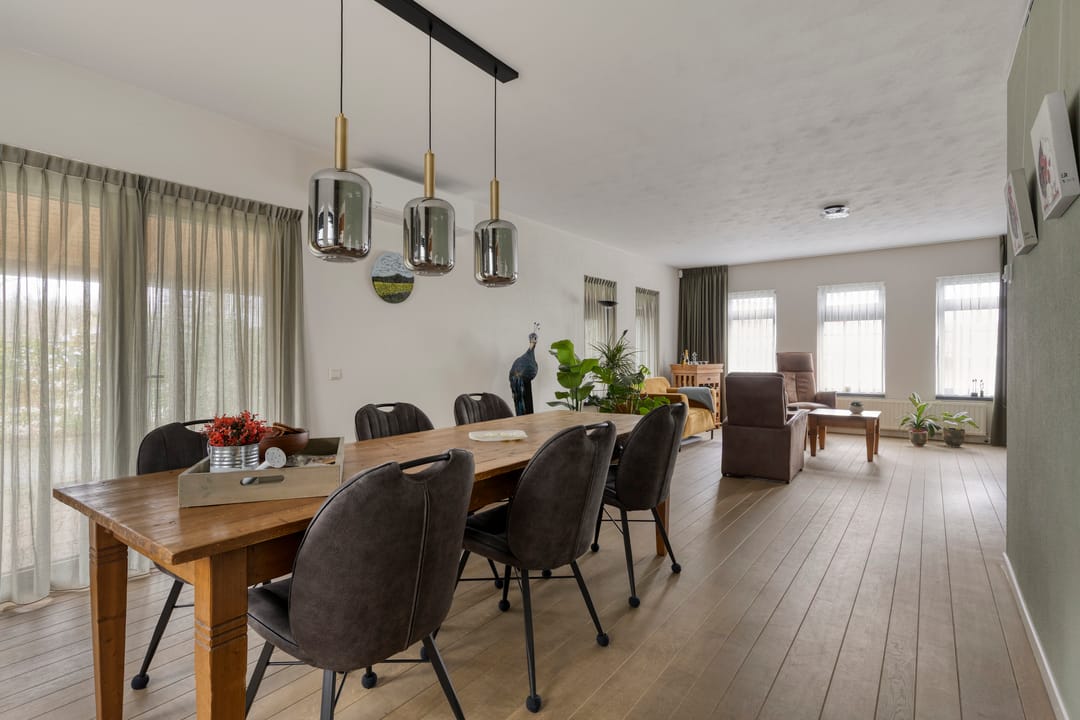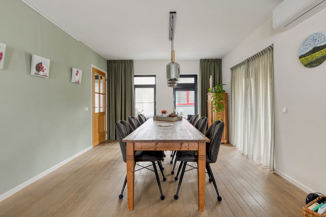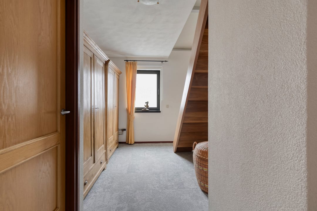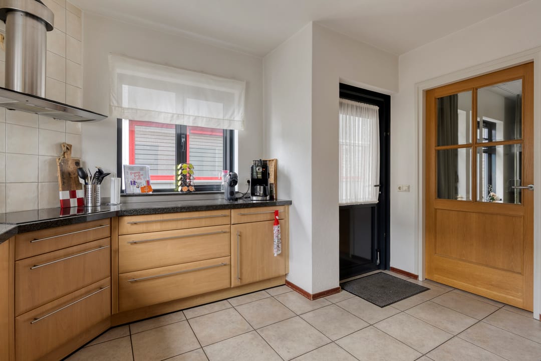 Begane grond met ruime hal, toiletruimte, urinoirruimte, woonkamer met houten vloer, airco en openslaande deuren naar een grote veranda en verharde tuin, woonkeuken met nette complete inrichting voorzien van koelkast, combi oven/magnetron, inductiekookplaat en vaatwasser, bijkeuken met witgoedaansluitingen, meterkast en buitendeur naar het verharde erf. Op de 1e verdieping is een overloop met separate toiletruimte, 3 slaapkamers en een badkamer voorzien van ligbad, douche en dubbele wastafel met meubel. Via een vaste trap is toegang tot de 2e verdieping. Hier is een grote open ruimte met zolderkamer, bergruimte en opstelling van de cv.-ketel. De tuin bij de woning is veelal gelegen aan de voorzijde en rechterzijde van de woning. Er is een grote veranda aangebouwd van circa 24 m².