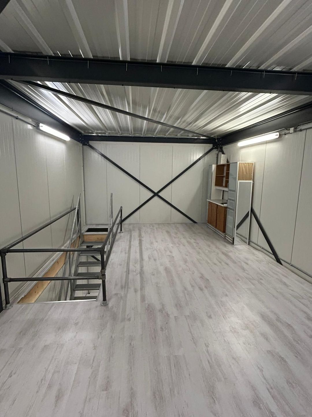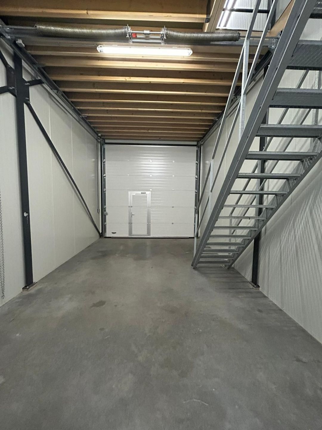 Bedrijfsruimte voorzien van een toilet, betonvloer, overheaddeur met een hoogte van ca. 4 meter en stalen trapopgang naar de verdieping.