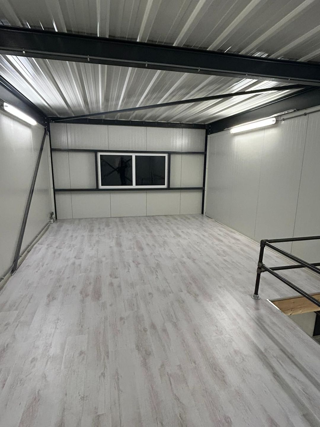 Bedrijfs-/kantoorruimte met houten verdiepingsvloer en keukenblok