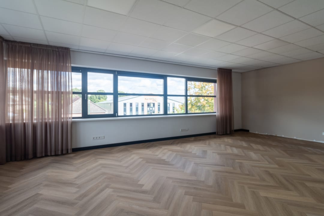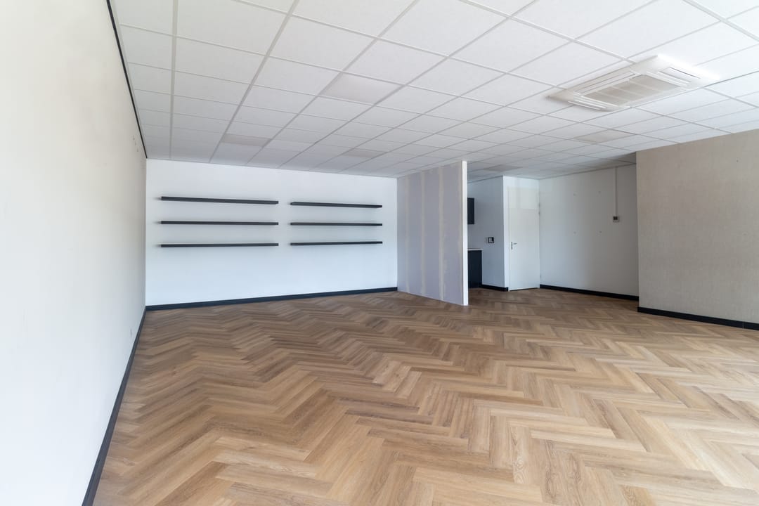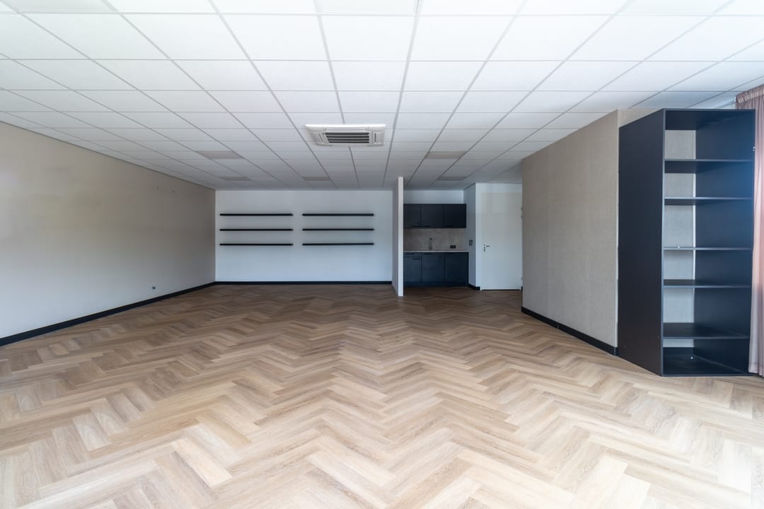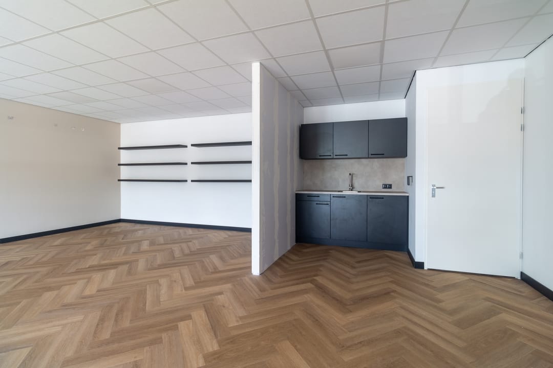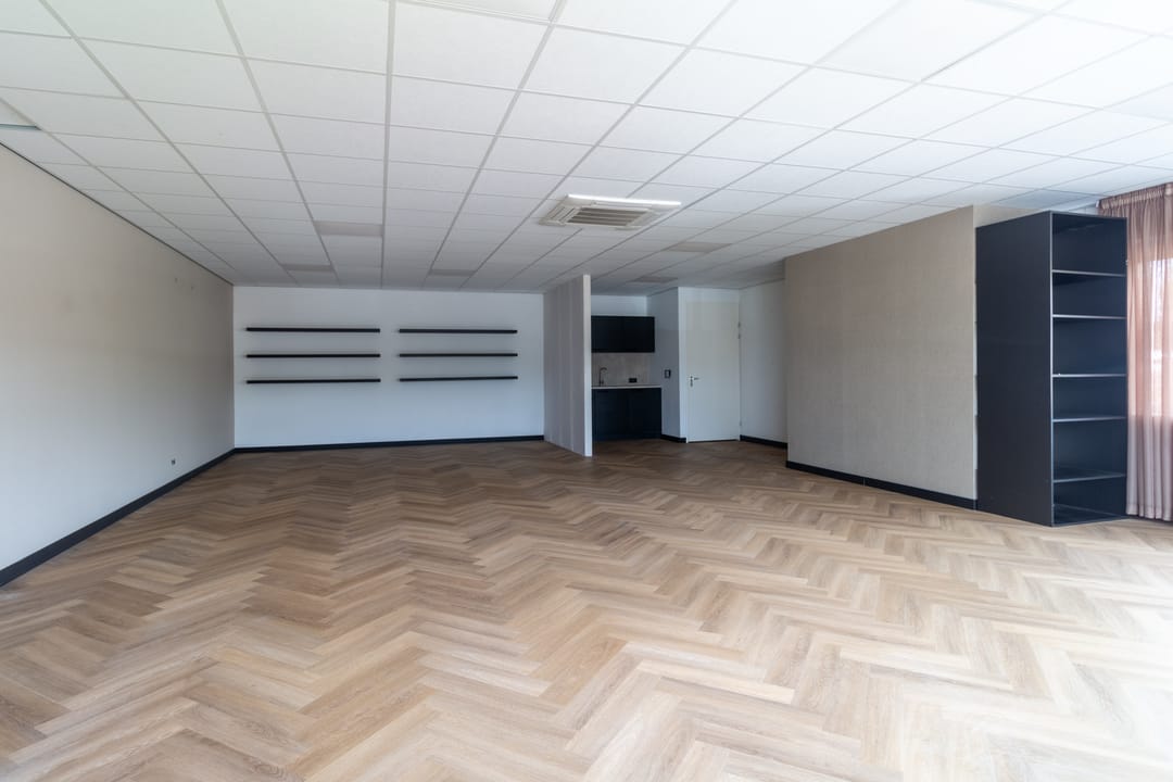 Entree met meterkast, middels een vaste trap is de verdieping beschikbaar. De open ruimte is opvallend licht door de grote raampartij aan de voorzijde waardoor een heerlijke werkruimte aanwezig is. De ligging is op het noorden waardoor geen direct inval van zon aanwezig is en de temperatuur beheersbaar blijft. Voor de hete zomerdagen is airconditioning aanwezig. Aan de achterzijde van de ruimte en een keurige pantry aanwezig met een toiletruimte.