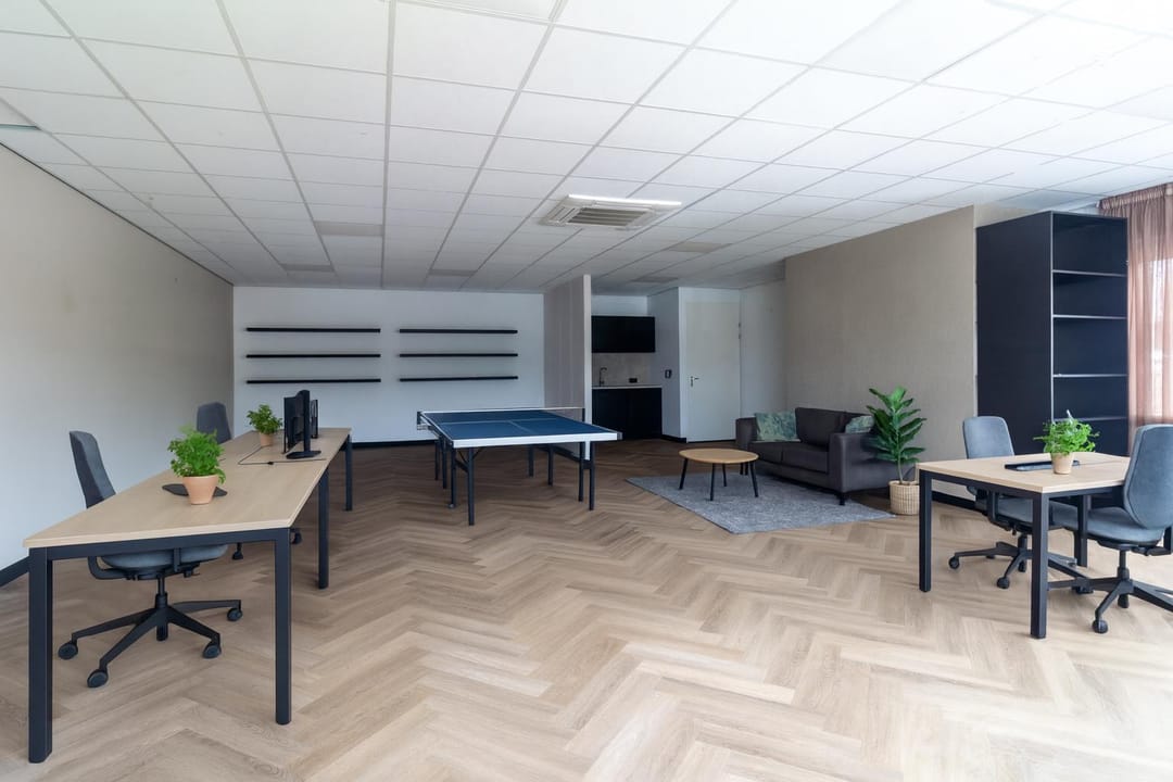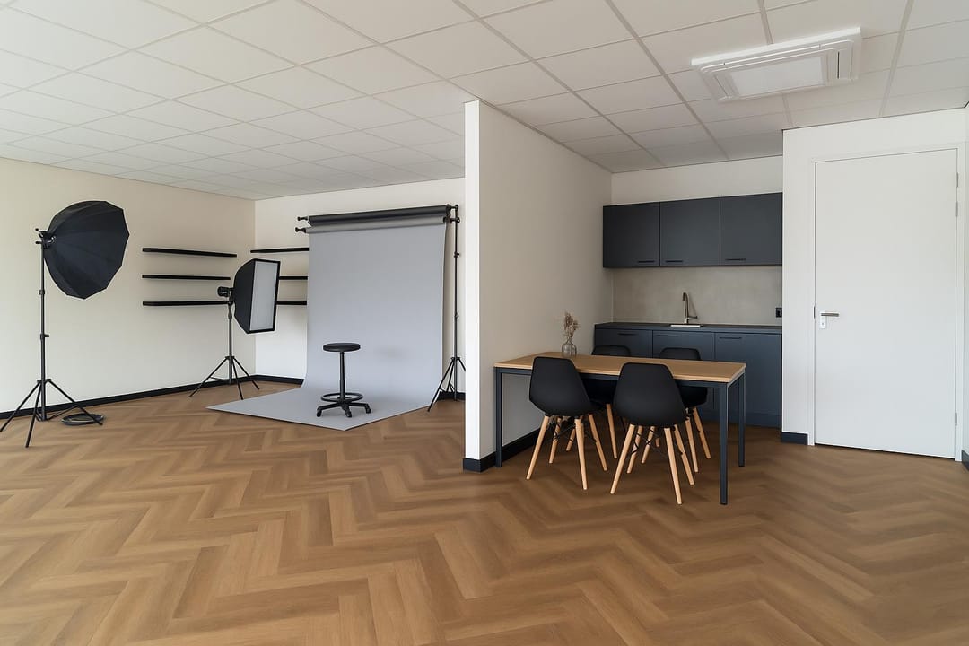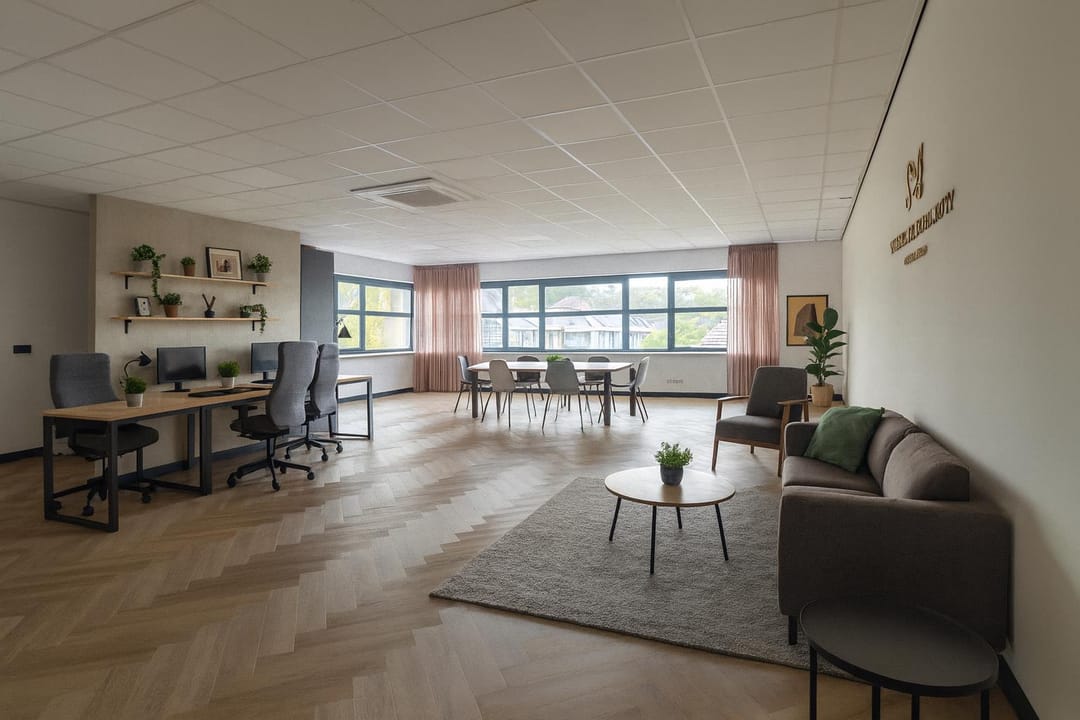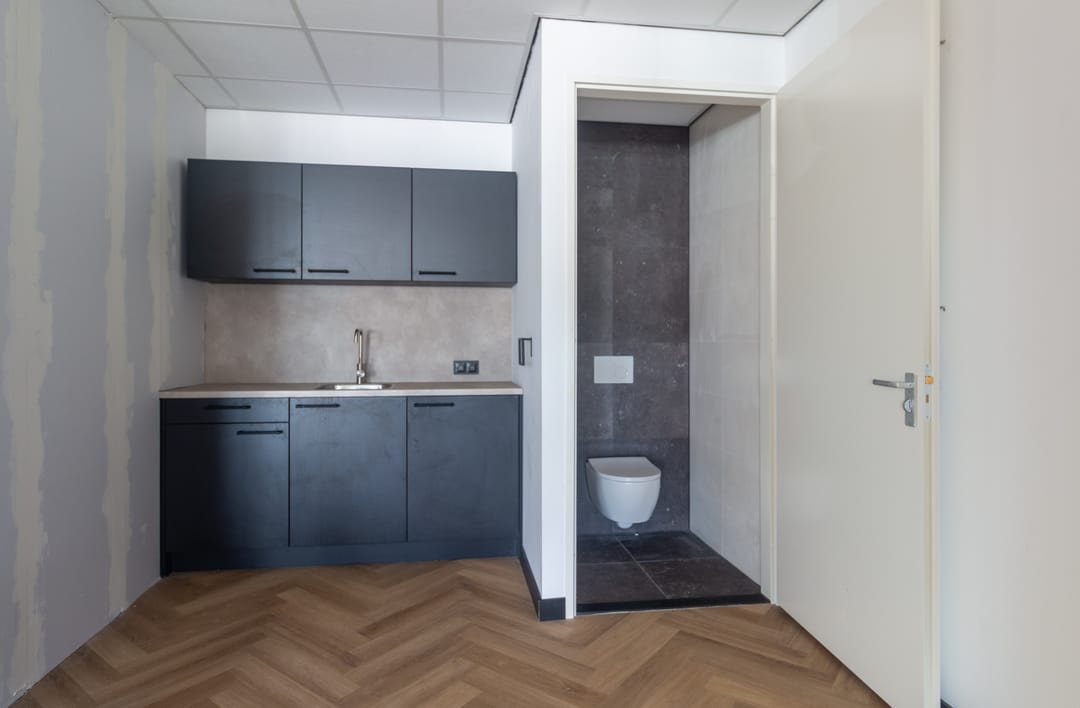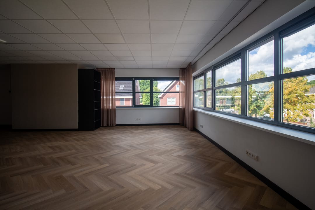 Entree met meterkast, middels een vaste trap is de verdieping beschikbaar. De open ruimte is opvallend licht door de grote raampartij aan de voorzijde waardoor een heerlijke werkruimte aanwezig is. De ligging is op het noorden waardoor geen direct inval van zon aanwezig is en de temperatuur beheersbaar blijft. Voor de hete zomerdagen is airconditioning aanwezig. Aan de achterzijde van de ruimte en een keurige pantry aanwezig met een toiletruimte.