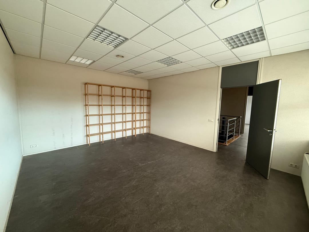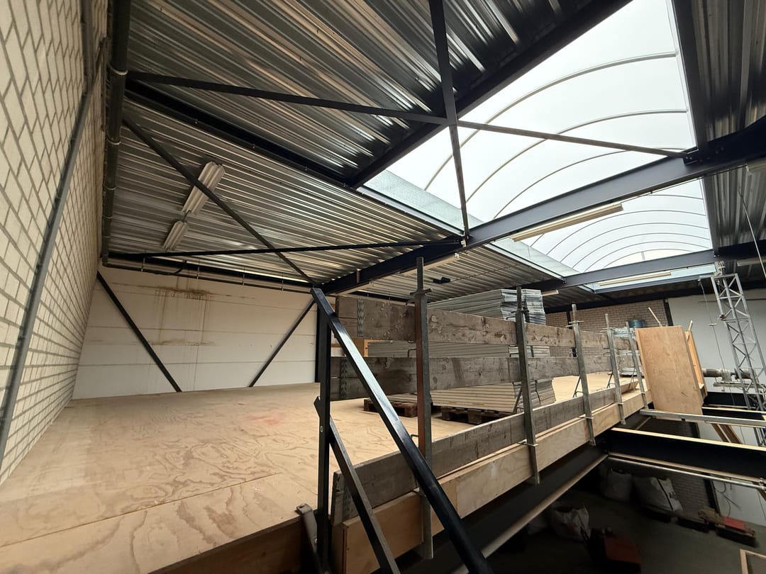 Hal 2 gesitueerd tegen de kantoorruimte, met entresol (vrije hoogte ca. 3m), overhead en een vrije hoogte onder de entresol van c.a 4,40m.