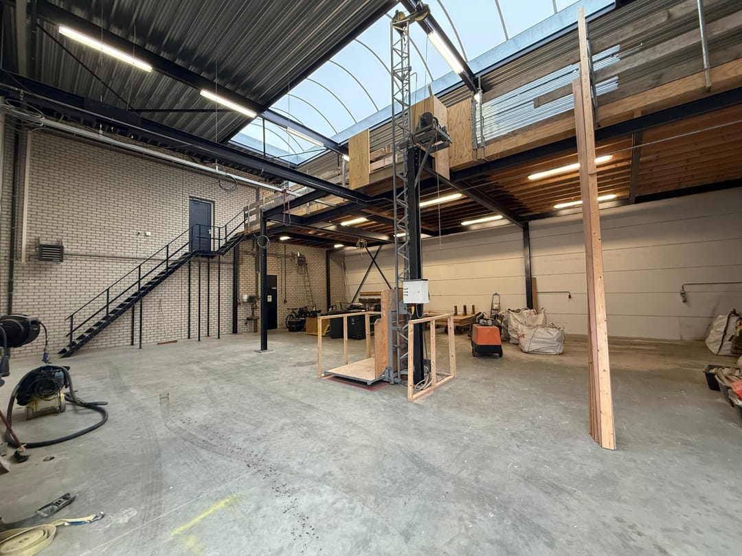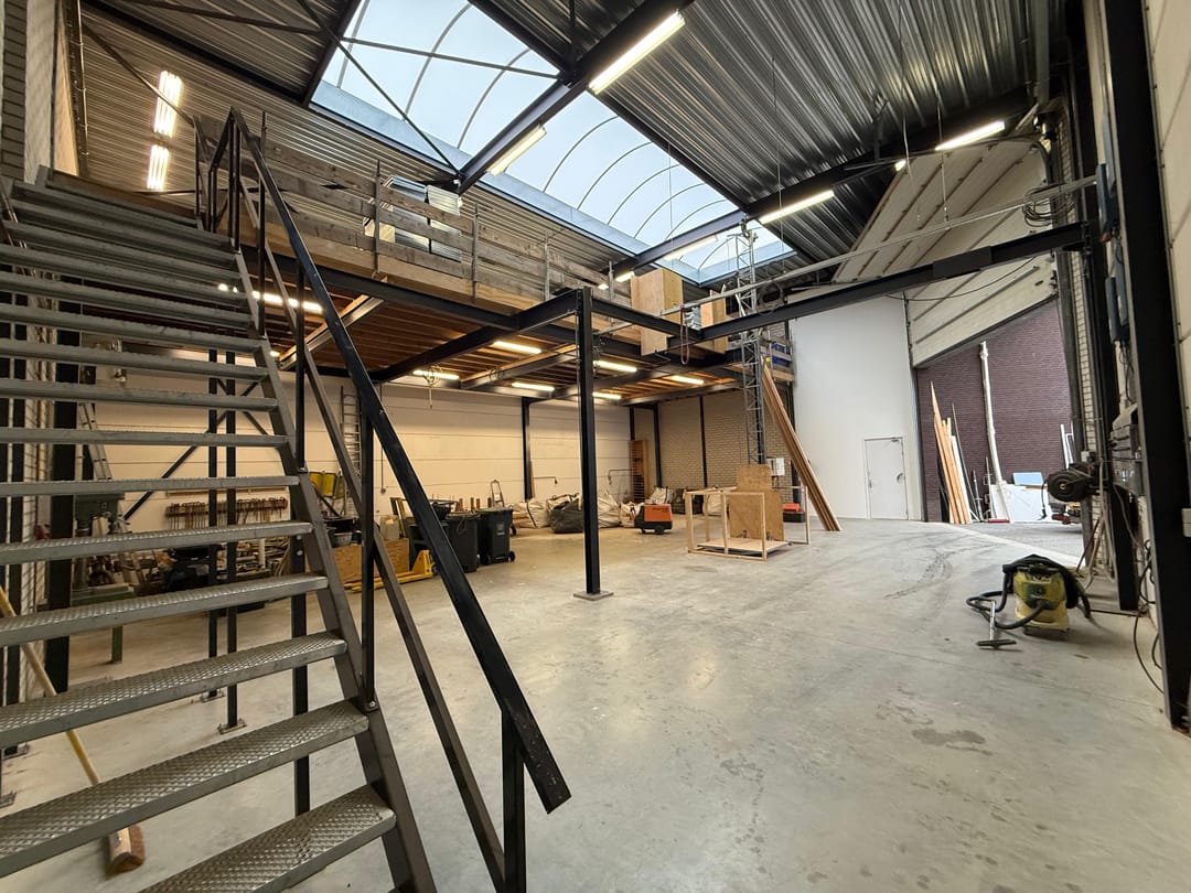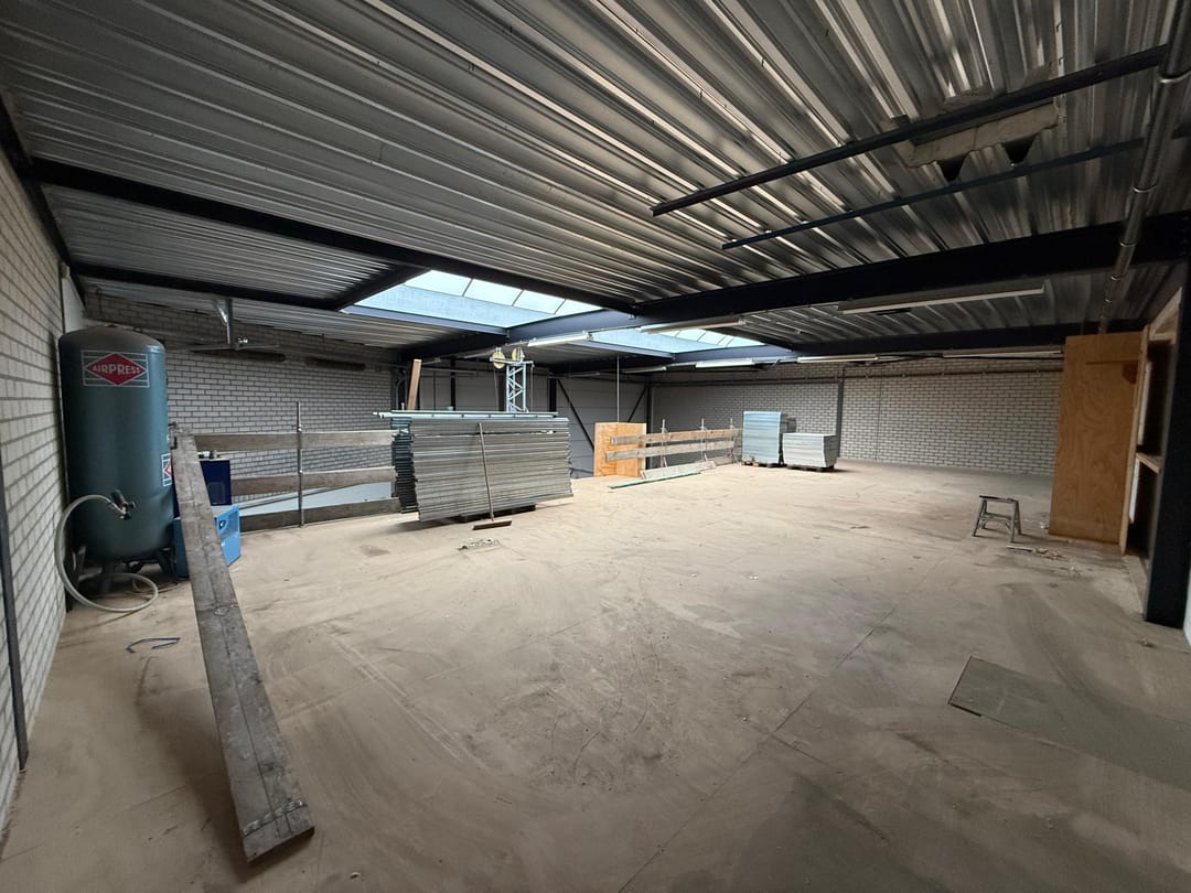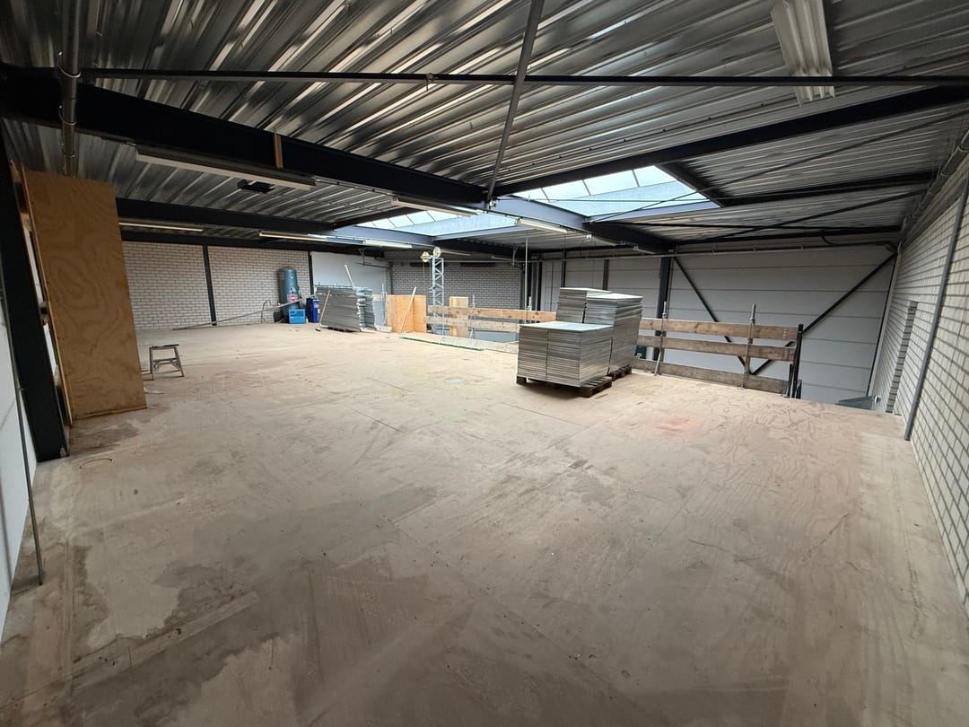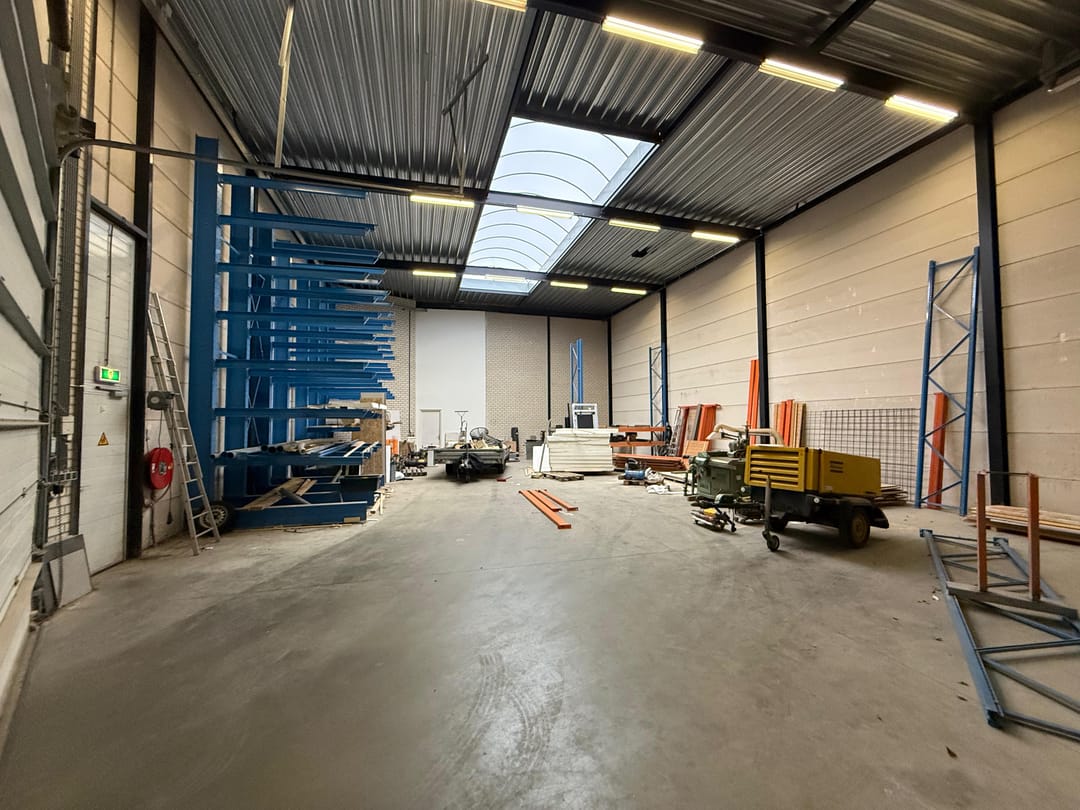 - Lichtstraten, overheaddeuren, krachtstroom, betonvloer, heater, toilet, mechanische ventilatie, inbouwarmaturen en te openen ramen