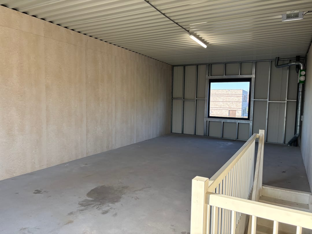 De ruimte is te betreden via de loopdeur aan de voorzijde of via de elektrische overheaddeur. Aan de rechterzijde is de trap naar de verdieping gesitueerd.