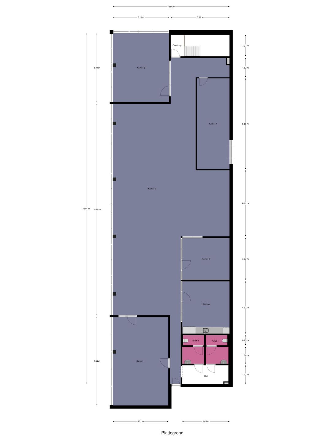 - Kamer 3 (grootste ruimte) biedt een open werkvloer van circa 22,67 x 10,86 m