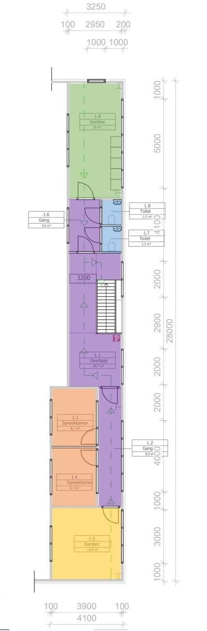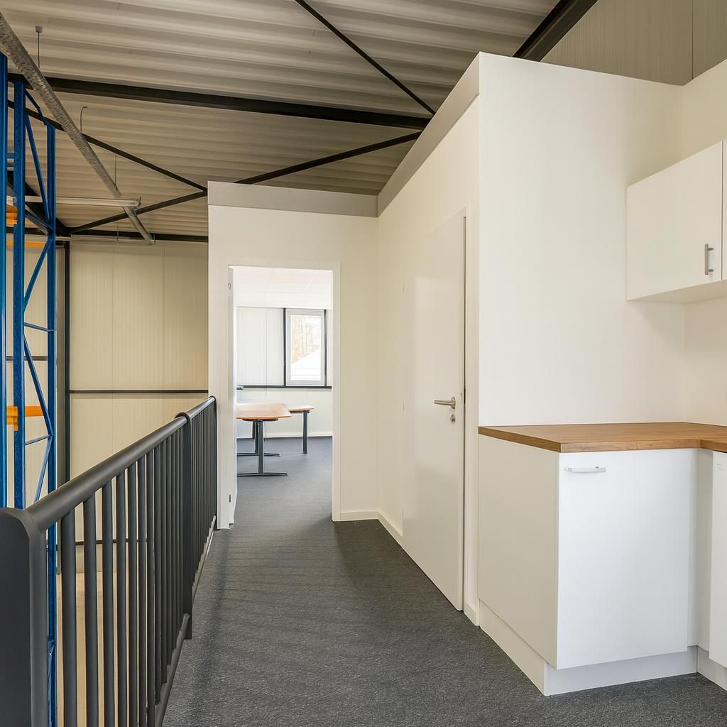 Via de stalen wenteltrap heeft u toegang tot de kantoren, de kantine en het toilet. Twee spreekkamers (8m²) en een kantoor (16m²) zijn voorzien van verlaagd plafond met led armaturen die tevens verwarmen. Half betegeld toilet voorzien van een fonteintje.